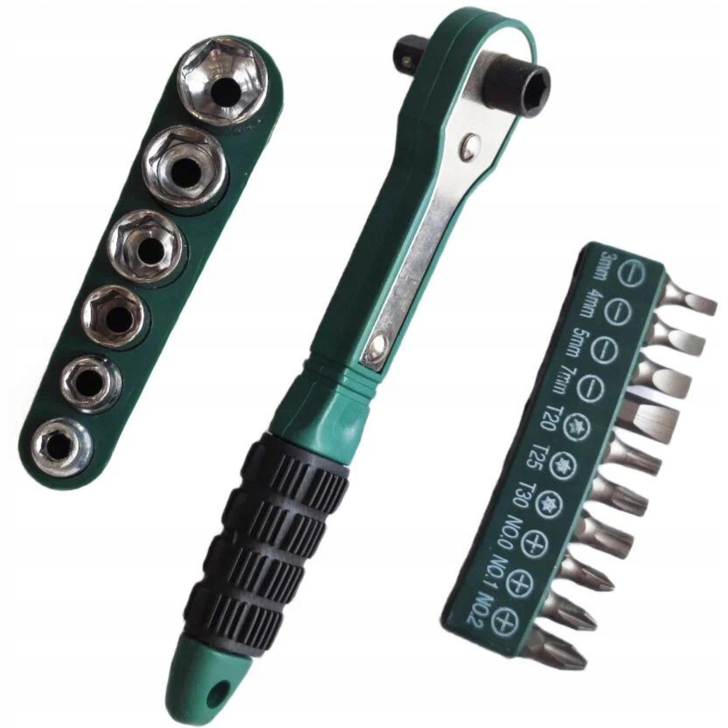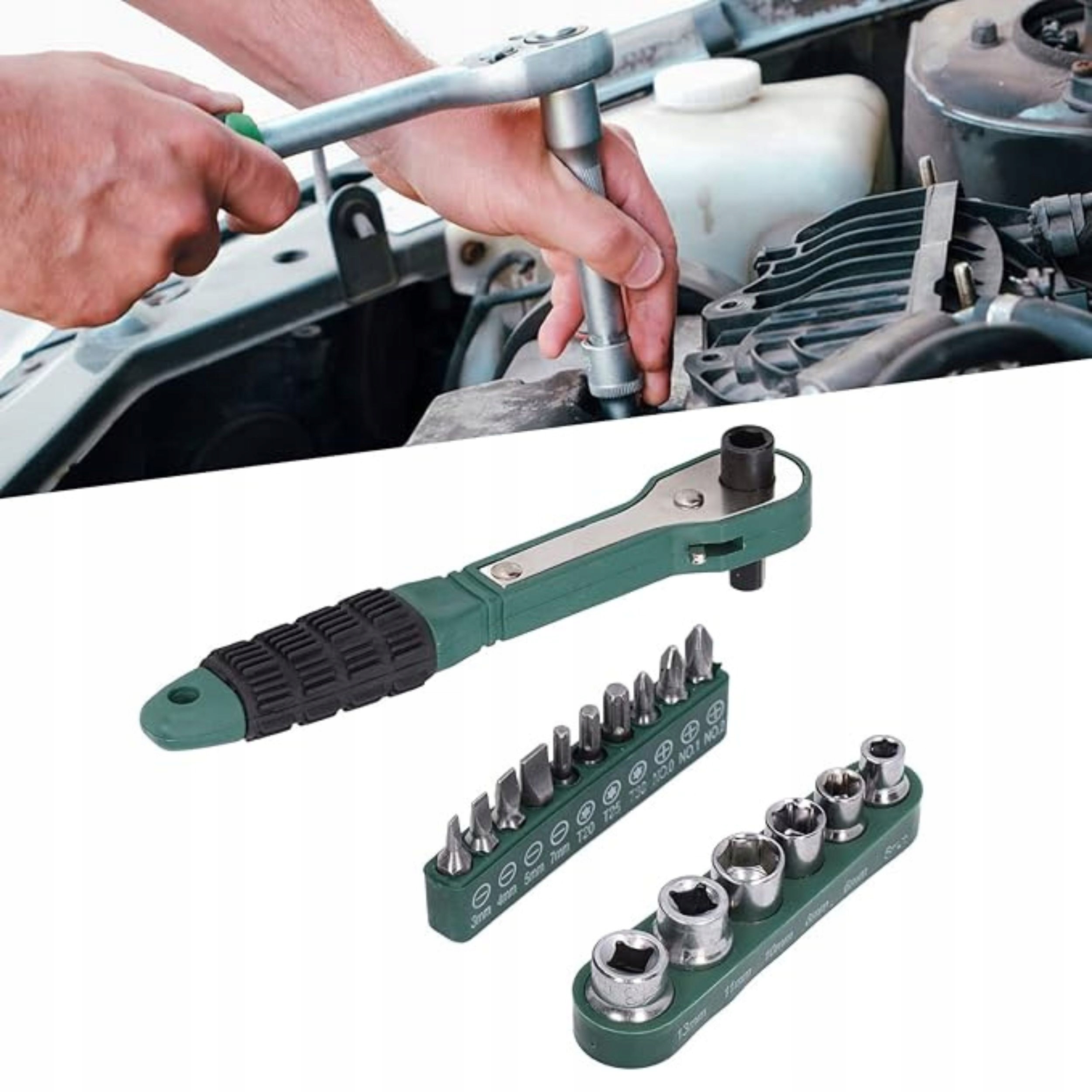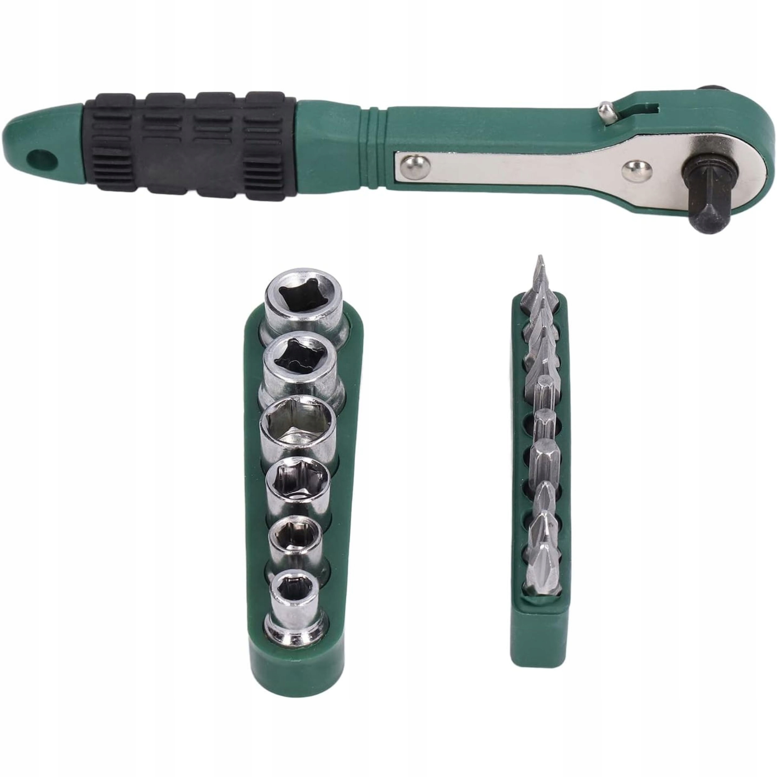 Набор инструментов, содержащий трещотку с удобной ручкой зеленого и черного цвета общей длиной 14,5 см и шириной головки 2,5 см, а также набор головок и насадок различных размеров.