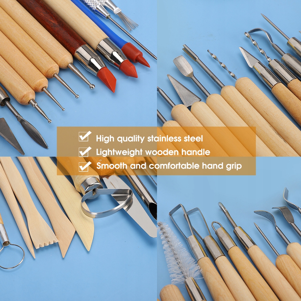 - Функция: подходит для гравировки, придания формы, моделирования, резки, соскабливания, чистки кистью, разглаживания, рисования маслом, украшения еды и тортов, бумажных цветов. В этот высококачественный набор инструментов входят деревянные инструменты для моделирования, металлические инструменты для моделирования, керамическое ребро.