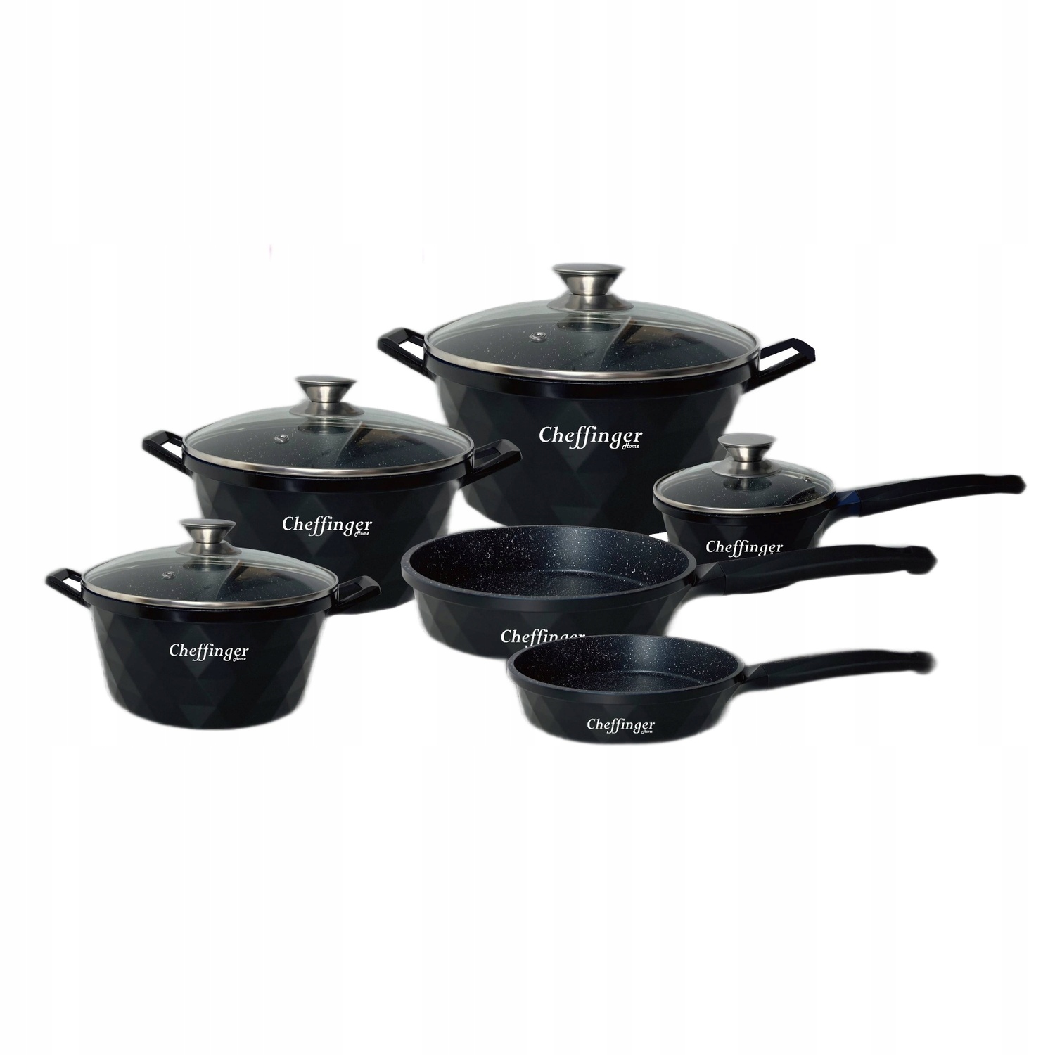 Эта кухонная утварь выглядит настолько хорошо, что ее можно оставить перед собой, даже когда она не используется. Набор состоит из 10 деталей - 3 кастрюли и кастрюли с приставной крышкой и 2 сковородок. Посуда изготовлена из синего алюминия с антипригарным покрытием, крышки — из стекла.