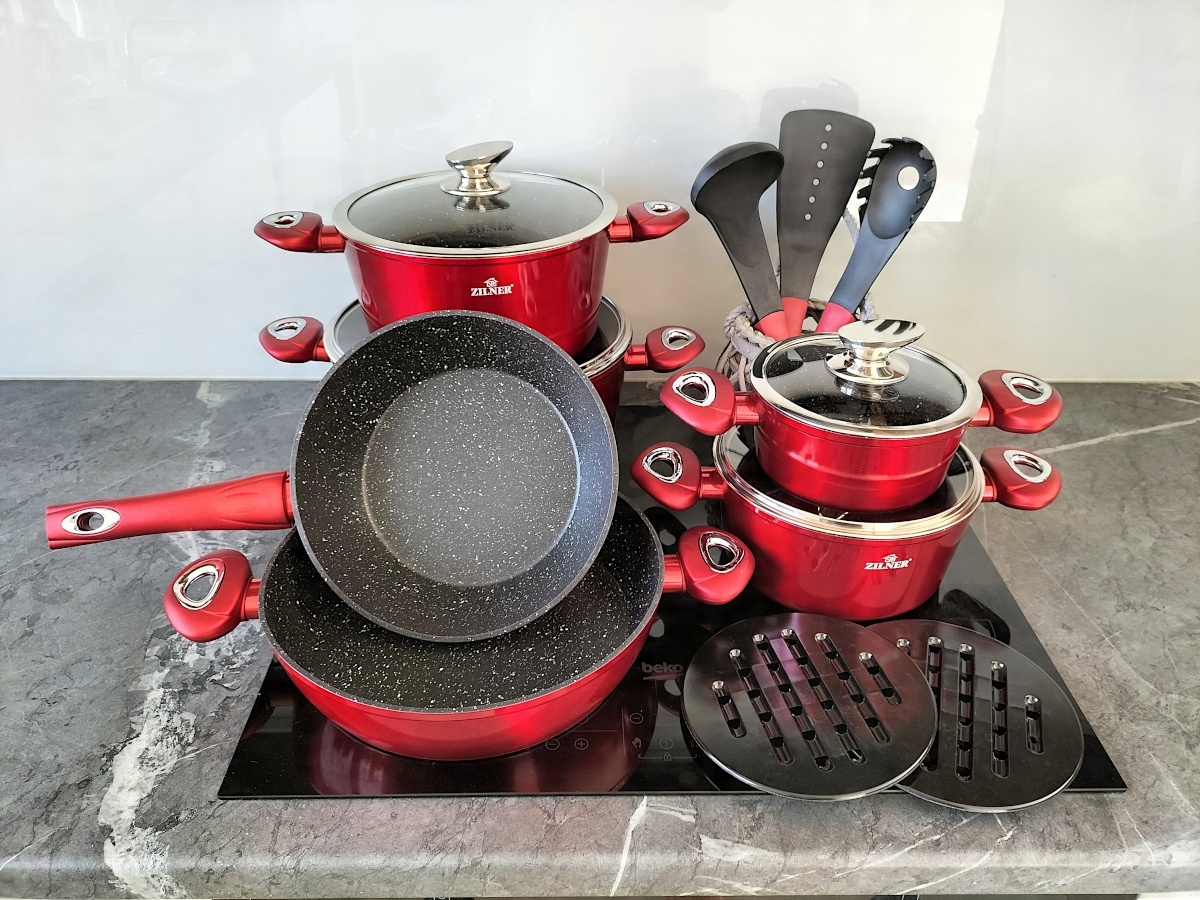 Представляем Вам роскошный набор кастрюлей из 15 предметов с антипригарным керамическим и мраморным покрытиемZILNER ZL-8516, который засияет вашей кухней. в новом великолепии!! Он состоит из четырех кастрюль разной вместимости с крышками, двух сковородок, двух жаропрочных подушечек и полезных кухонных принадлежностей.