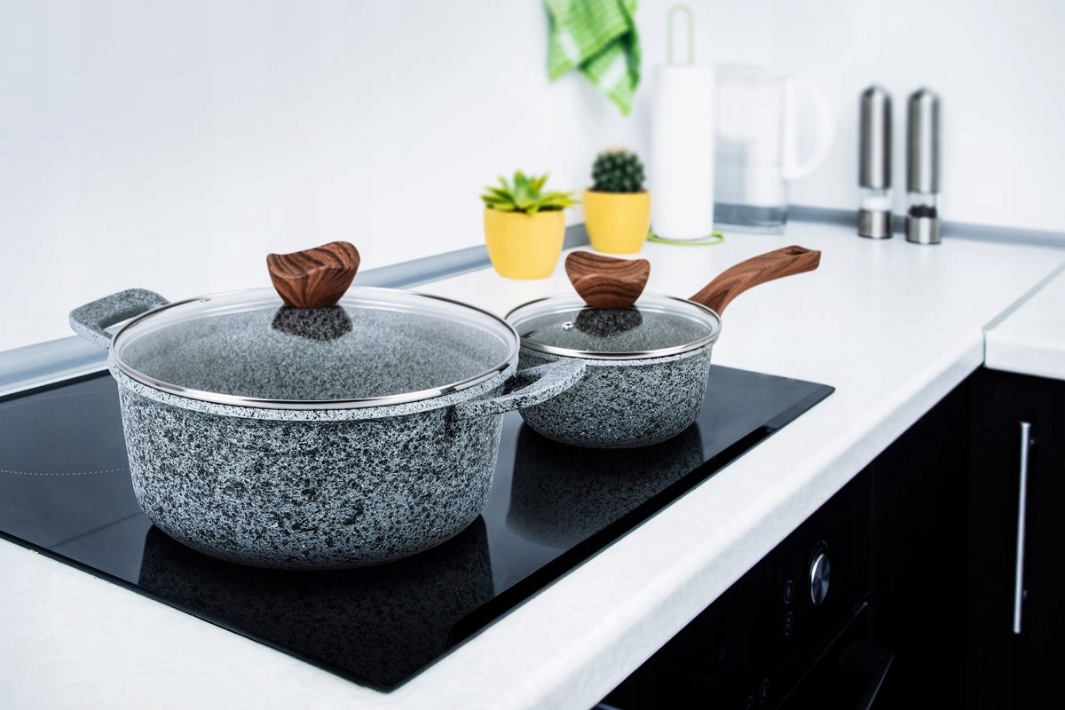 Наши горшки изготовлены из толстого алюминия, покрытого покрытием, которое состоит из керамической массы, частиц камня (гранит) и анти -адгезивных (не -стильных). Этот состав покрытия в сочетании с алюминиевым листом вызывает то, что горшок имеет высокую тепловую инерцию (он сохраняет дольше температуры) и очень хорошее распределение тепла, , как чугунный горшок, , но он намного легче, чем он.