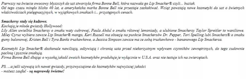 Оплачивая «НАБІР ГУБНОЇ ПОМАДИ LIP SMACKER CC CHERRY+ FANTA ORANGE», вы можете быть уверены, что данное изделие из каталога «Стеллаж» будет доставлено из Польши и проверено на целостность. В цене товара, указанной на сайте, учтена доставка из Польши. Внимание!!! Товары для Евросоюза, согласно законодательству стран Евросоюза, могут отличаться упаковкой или наполнением.