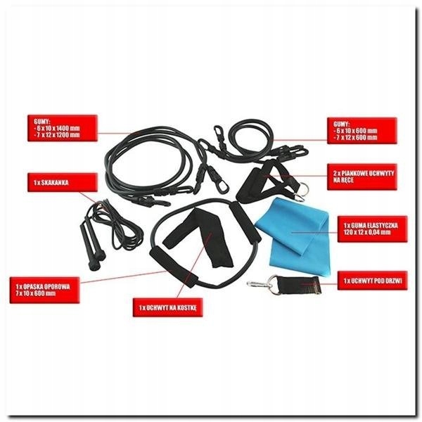 В комплект входят четыре эспандера, одна резинка, одна эспандер, две пенопластовые ручки, одна ручка для щиколотки, одна дверная ручка и скакалка.