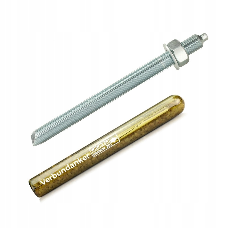 Вставка композитного анкера состоит из стеклянной трубки, состоящей из смеси смолы и крупного кварца. песок и внутренняя трубка, наполненная отверждающим порошком. Анкерный стержень вводят в ствол скважины с помощью бура ударным и вращательным способом. В ходе этого процесса стеклянные трубки разрушаются. Кварцевый песок измельчает осколки стекла и однородно перемешивает смолу и отвердитель. Смесь заполняет пространство между соединителем и стенкой колодца. После затвердевания смеси анкерный стержень можно подвергнуть определенной нагрузке.
