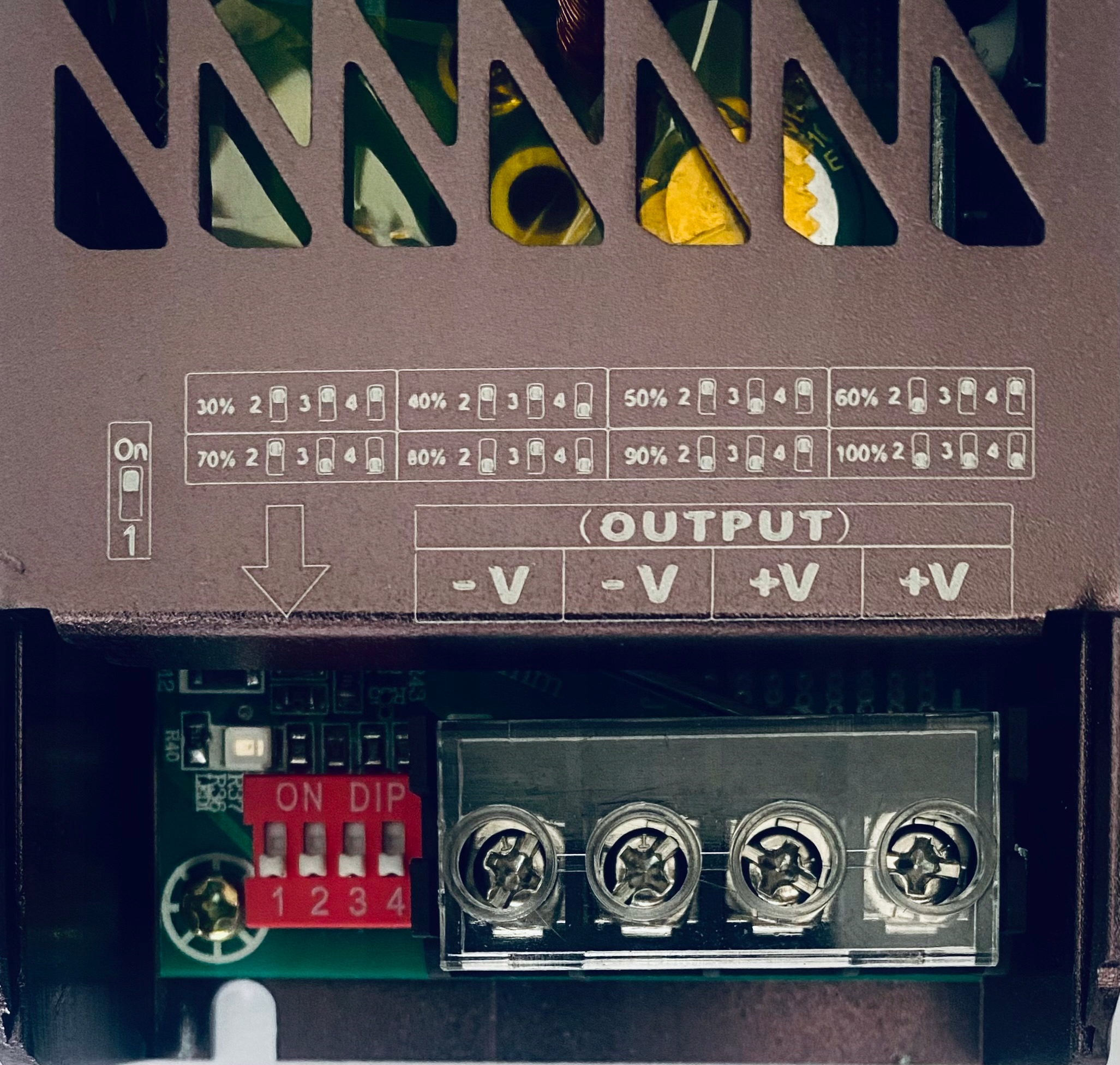 2) С помощью переключателей 2–3 можно установить интенсивность света в соответствии со схемой, видимой на блоке питания (до 8 программ 30%, 40%, 60%, 60%, 70%, 80%, 90%, 100%)