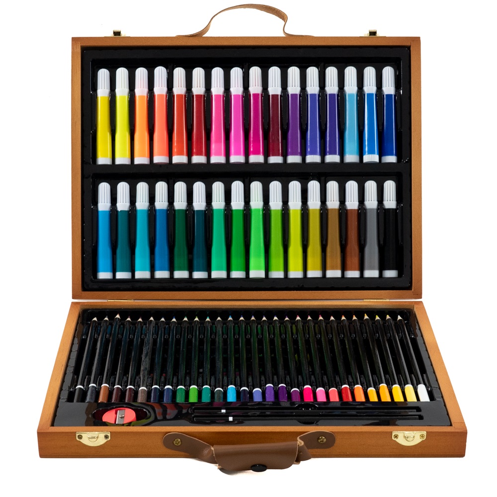 Весь набор можно легко взять с собой на природу или в гости к друзьям благодаря практичному чемодану. Состоит из двух частей с рельефными отделениями для мелков, фломастеров и аксессуаров. Каждый элемент имеет свое место, что позволяет поддерживать порядок на протяжении всего использования. Все элементы организованы и защищены благодаря прочному корпусу.