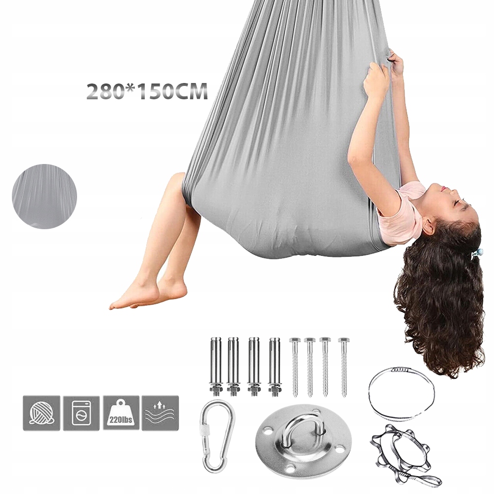 【СЕНСОРНЫЕ КАЧЕЛИ ДЛЯ ИСПОЛЬЗОВАНИЯ В ПОМЕЩЕНИИ, МЯГКИЕ И УДОБНЫЕ】 Эти терапевтические качели изготовлены из высококачественного материала - мягкого и шелковистого нейлона. Имеет размеры 150 х 280 см. Дети могут удобно расположиться в гамаке, чувствуя себя спокойно и расслабленно. Наш модернизированный детский гамак блокирует нежелательную сенсорную стимуляцию. Детские качели прочные и безопасные и могут весить до 100 кг.