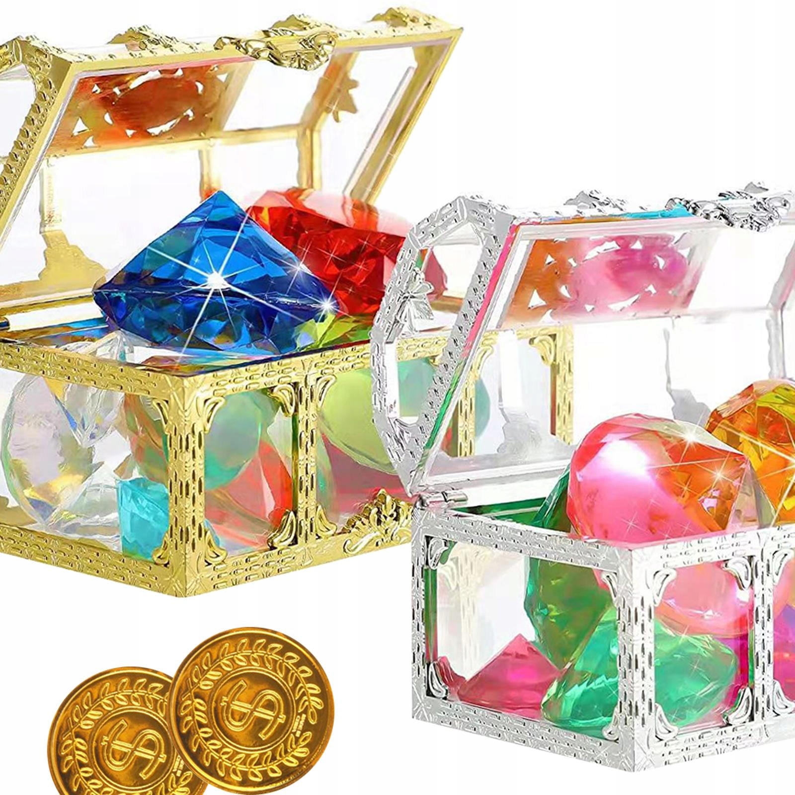Стиль B: 24 предмета. Игровой набор для дайвинга B: каждый игровой набор для плавания содержит 12 драгоценных камней, 2 большие (40 мм), 4 средних (30 мм), 3 маленьких (20 мм) драгоценных камня и 3 золотых монеты (35 мм), 2 набора (24 штуки) драгоценных камней, 2 винтажные мини-пиратские коробки с сокровищами (1 серебряная и одна золотая пиратская коробка с сокровищами)