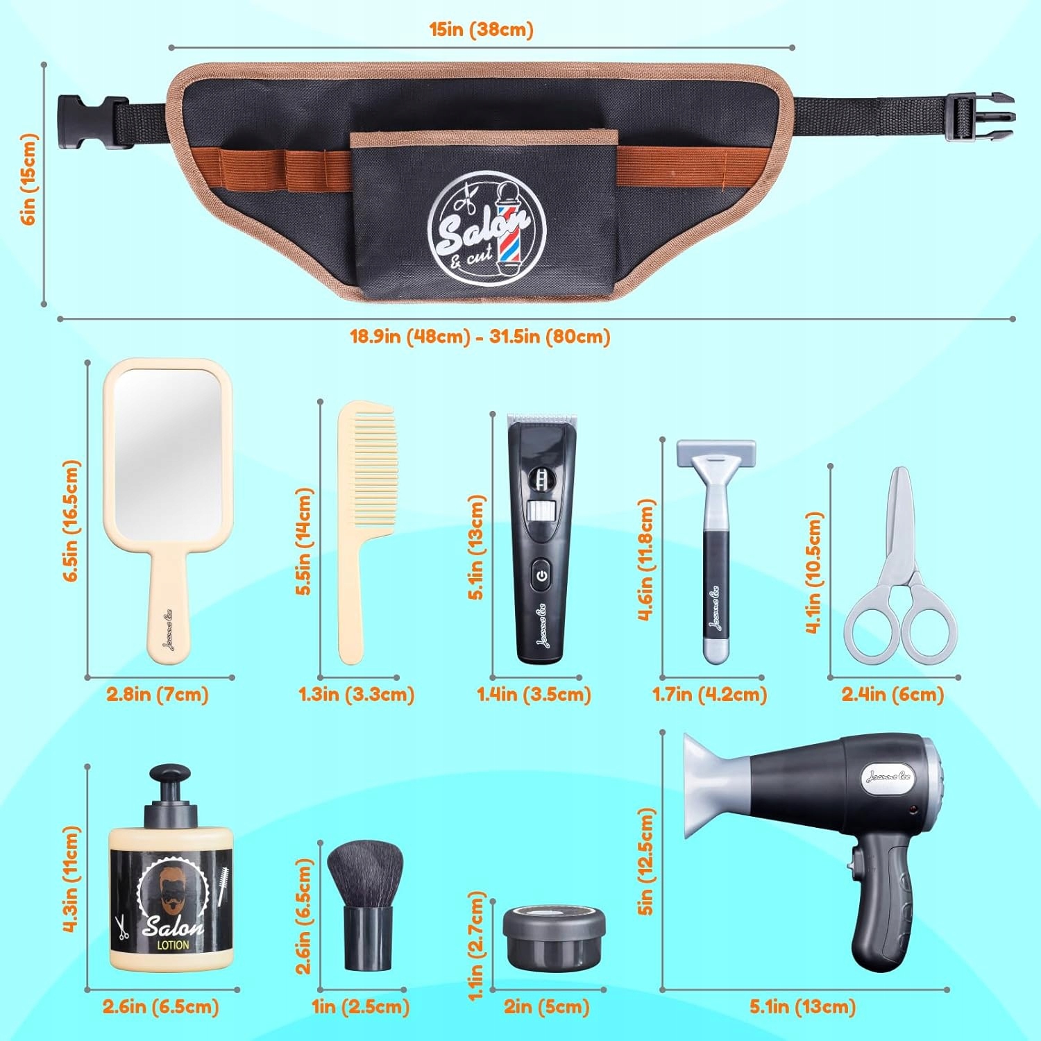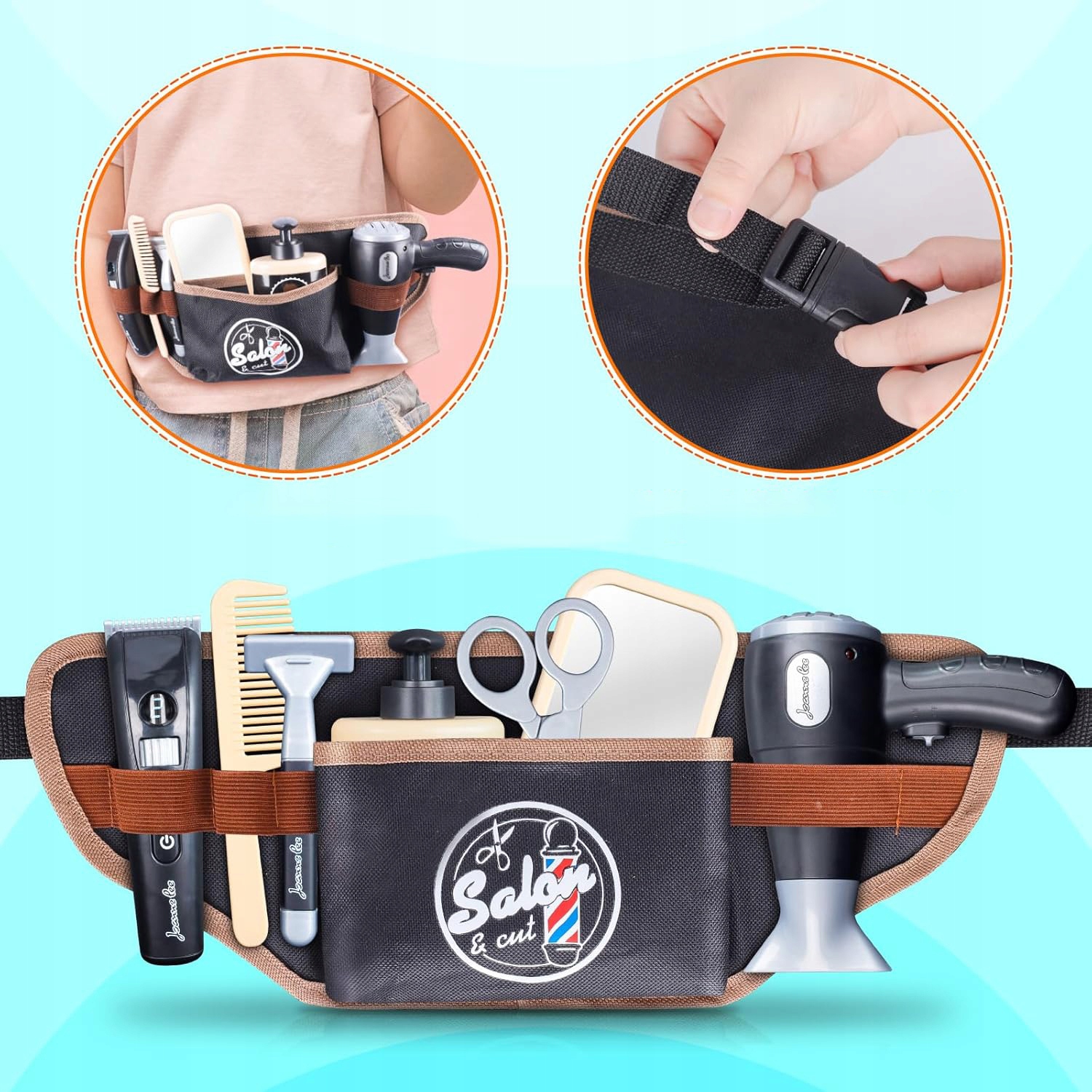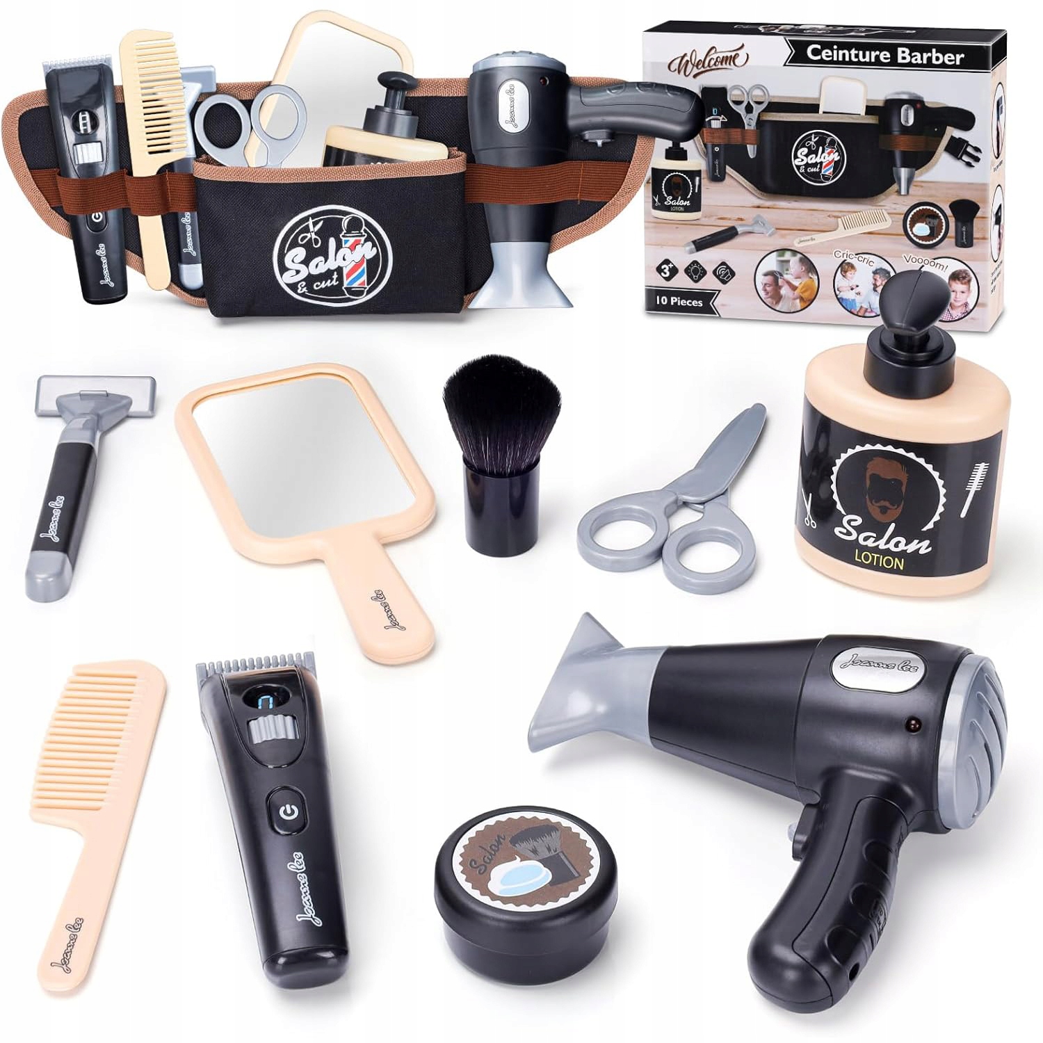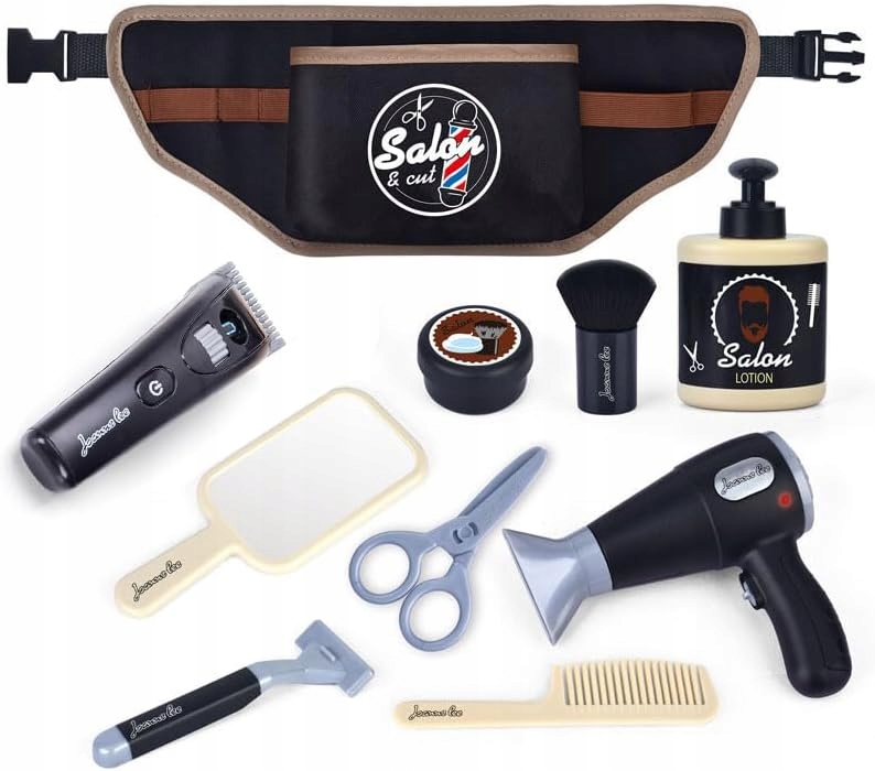 💈 - Набор парикмахерских игрушек для ролевых игр, позволяющих создать собственный опыт в парикмахерской, включая 10 имитированных парикмахерских инструментов, таких как искусственные парикмахерские ножницы, зеркало, фен, пояс для инструментов, искусственная бритва и многое другое.
