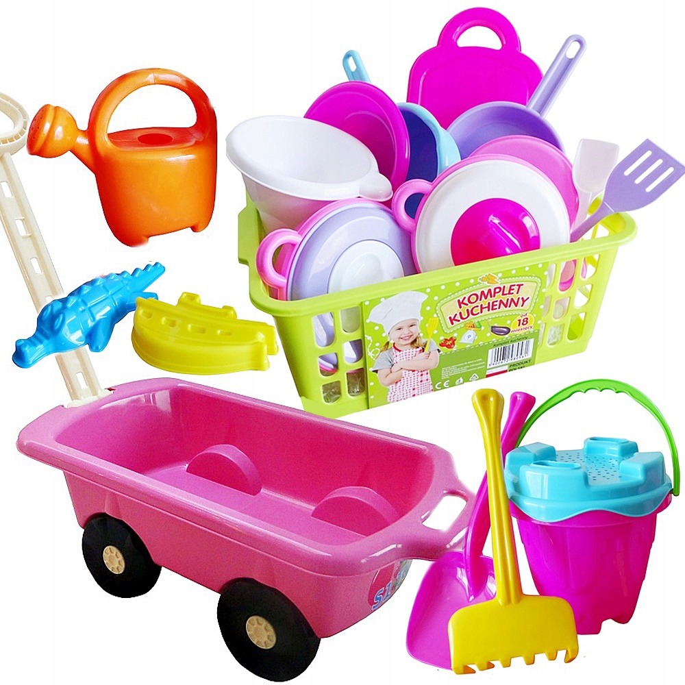 ТЕЛЕЖКА С РУЧКОЙ + БОЛЬШИЕ ГОРШКИ + НАБОР ПЕСКА (ВЕДРО, МОЛНИЯ, ЛЕЙКА, СИТОК, ЛОПАТА, РАББЫ, ФОРМЫ) - ПОЛЬСКИЙ ТОВАР!!! - ВЫСОКОЕ КАЧЕСТВО!!!