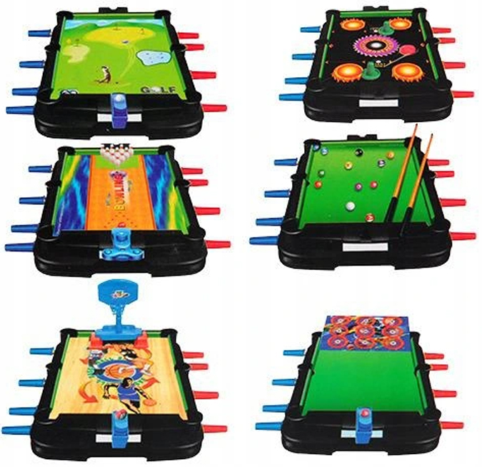 - Набор настольных игр <ли>1. ГОЛЬФ: мячи включены. <ли>2. ЧАСТЬ ЗОСНИЦА: В комплект входят 2 детали и шарик. <ли>3. БАСКЕТБОЛ: В комплект входит 1 мяч, доска, корзина, пусковая установка. <ли>4. СТРЕЛЬБОВОЕ ТИР: пусковая установка и пули в комплекте. <ли>5. БОУЛИНГ: В комплект входят 10 кеглей и пусковая установка для мячей. <ли>6. БИЛЬЯРД: в комплект входят 2 кия и 10 шаров.