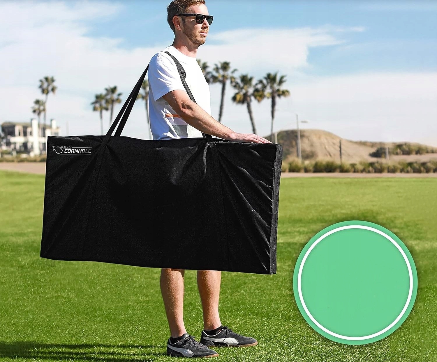 В комплект игры входят 2 высококачественные водонепроницаемые складные доски размером 1,2 х 0,6 м, изготовленные из твердая плита МДФ, 8 сумок для переноски и портативный чемодан.