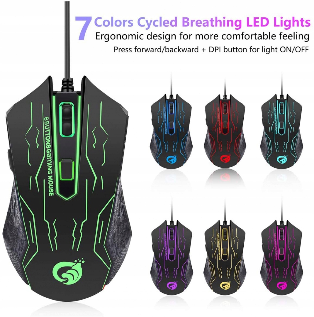 Оптическая мышь RGB, переменное разрешение DPI: 1200–1800–2400–3600, легко переключаемое кнопкой. Оснащен 6 кнопками. Яркость красочной подсветки, лучшая видимость для геймеров.