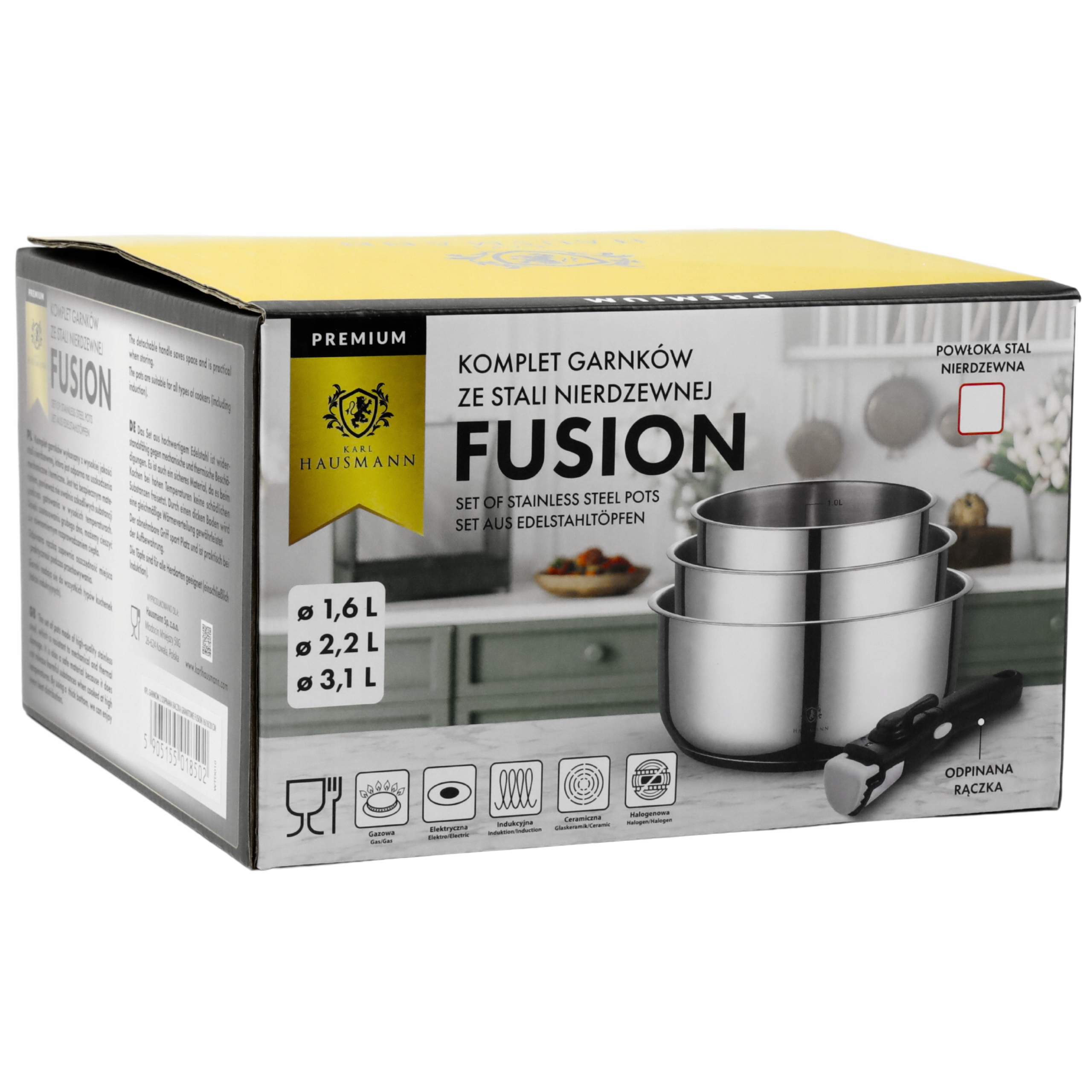 Набор слияния изготовлен из высокого качества из нержавеющей стали 18/0 , что обеспечивает устойчивость к устойчивости к коррозии . elegance , но также предотвращает прилипание блюд , что облегчает приготовление пищи и промывки . дополнительно до Набор горшков имеет съемную ручку , которая подходит для каждого горшка отдельно .