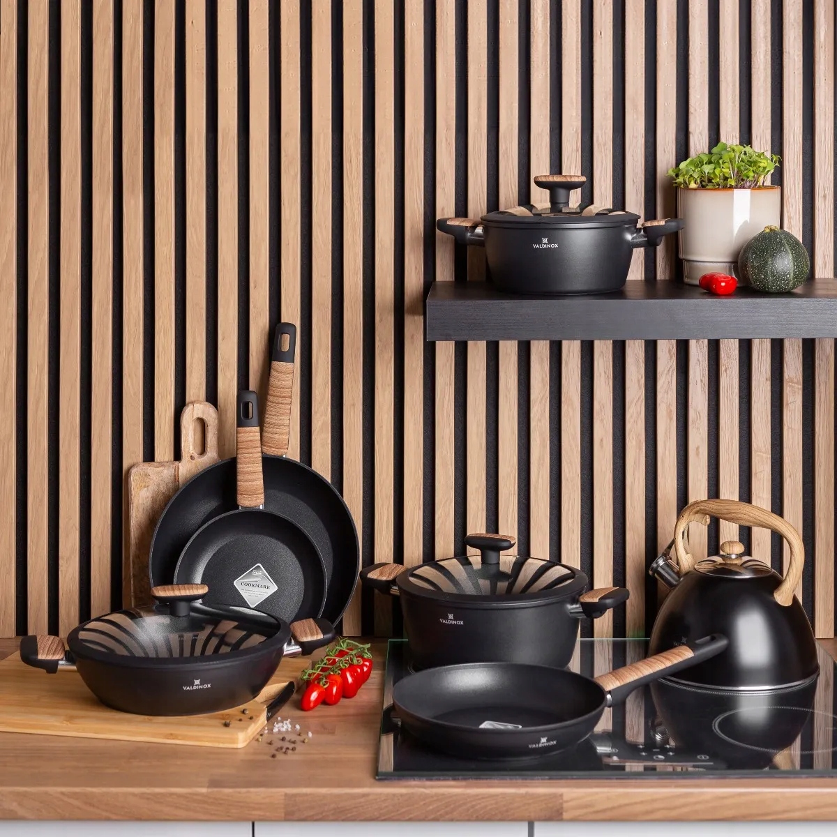 The Valdinox Коллекция Spartan – это современный и стильный кухонный гарнитур, разработанный с использованием они думают об эффективном приготовлении пищи и эстетичном внешнем виде. Посуда изготовлена из высококачественного алюминия, что обеспечивает равномерное распределение тепла и, следовательно, лучший контроль над процессом приготовления. Матовая черная отделка в сочетании с элегантными ручками, имитирующими дерево, создает современный и минималистичный дизайн, который идеально подойдет для любой кухни.