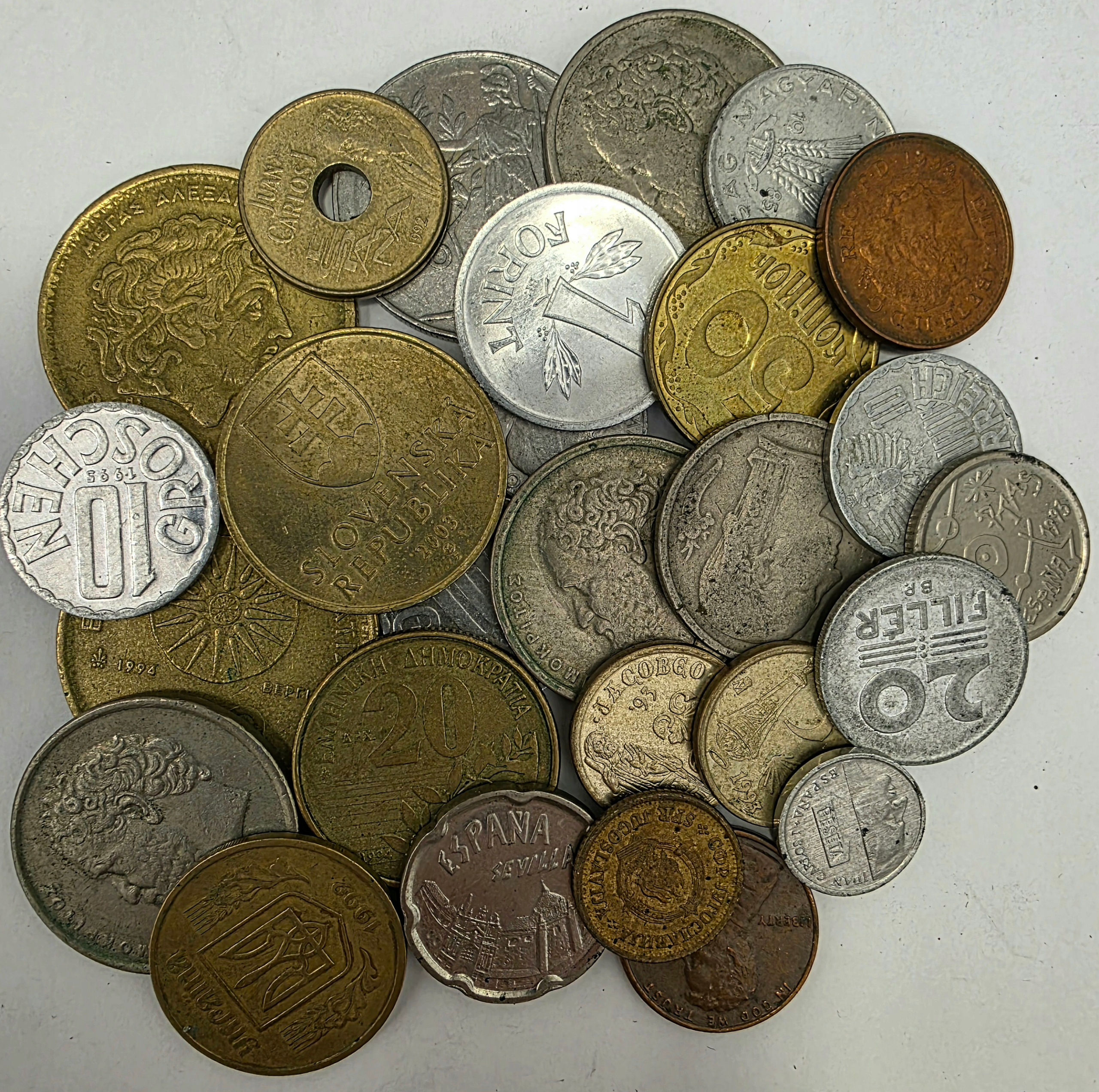 Монеты происходят из разных стран и периодов, в том числе: Словакии, Венгрии, Австрии, Испании, Греции, Великобритании, Франции, Германии, Италии, Норвегии и других.