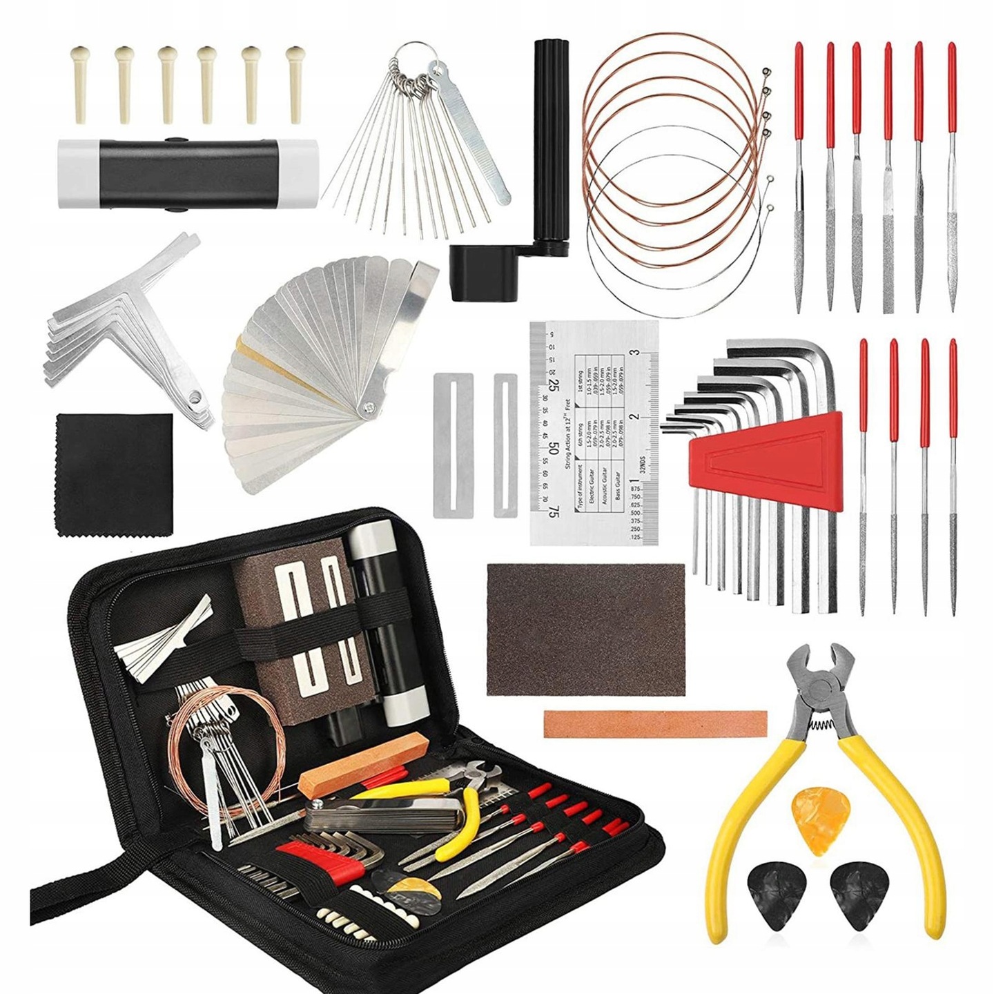 Полный комплект для обслуживания и Гитарное регулирование Акустическое, классическое, электрическое и бас. Он содержит клавиши Allen, намотки струн, отвертка, суппорт, измеритель высоты струны, кубики и другие аксессуары. Необходимо для музыкантов и припоев. Все в практическом случае , облегчающее хранение. Музыканты