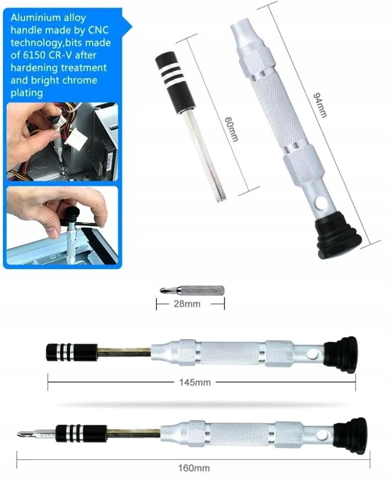 Набор сервисов будет широко использоваться и может быть успешно использован в ремонте ювелирных изделий и часового производства , а также при ремонте электронного оборудования или оптического . Это также идеально подходит для небольшого домашнего ремонта , которые требуют отверток.