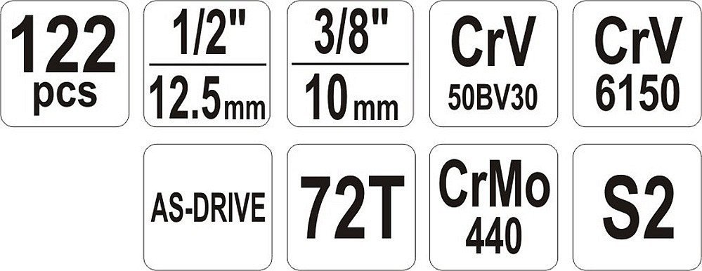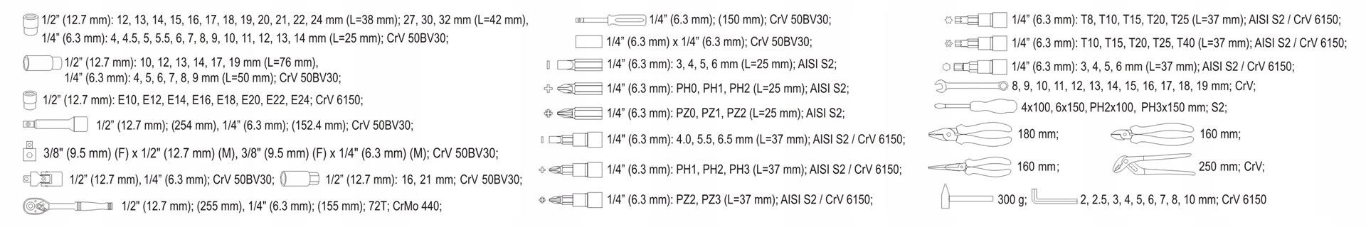 Это набор из 122 гаечных ключей и головок, предназначенный для профессионального использования в автосервисах и механических мастерских. В комплект входит широкий выбор метрических головок 1/2" и 1/4", а также головок с отвертками (плоские, Pozidriv, Philips, Allen, Torx). Набор предназначен для требовательной и точной работы при больших нагрузках.