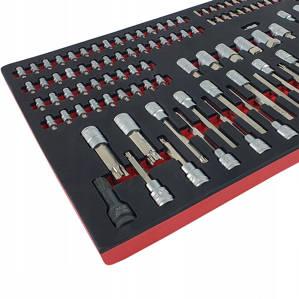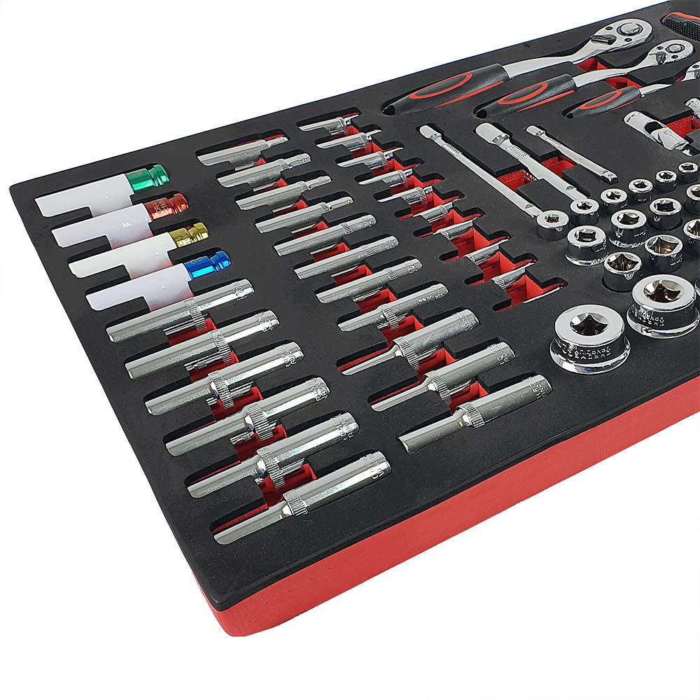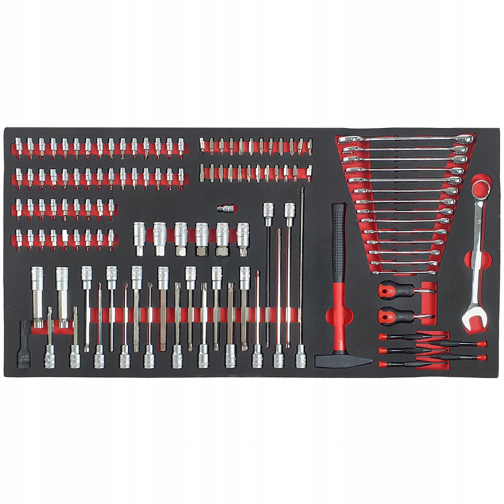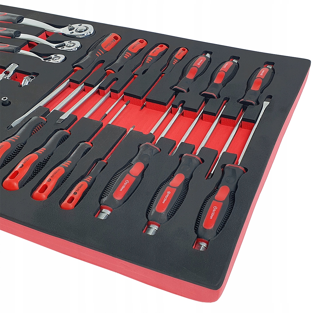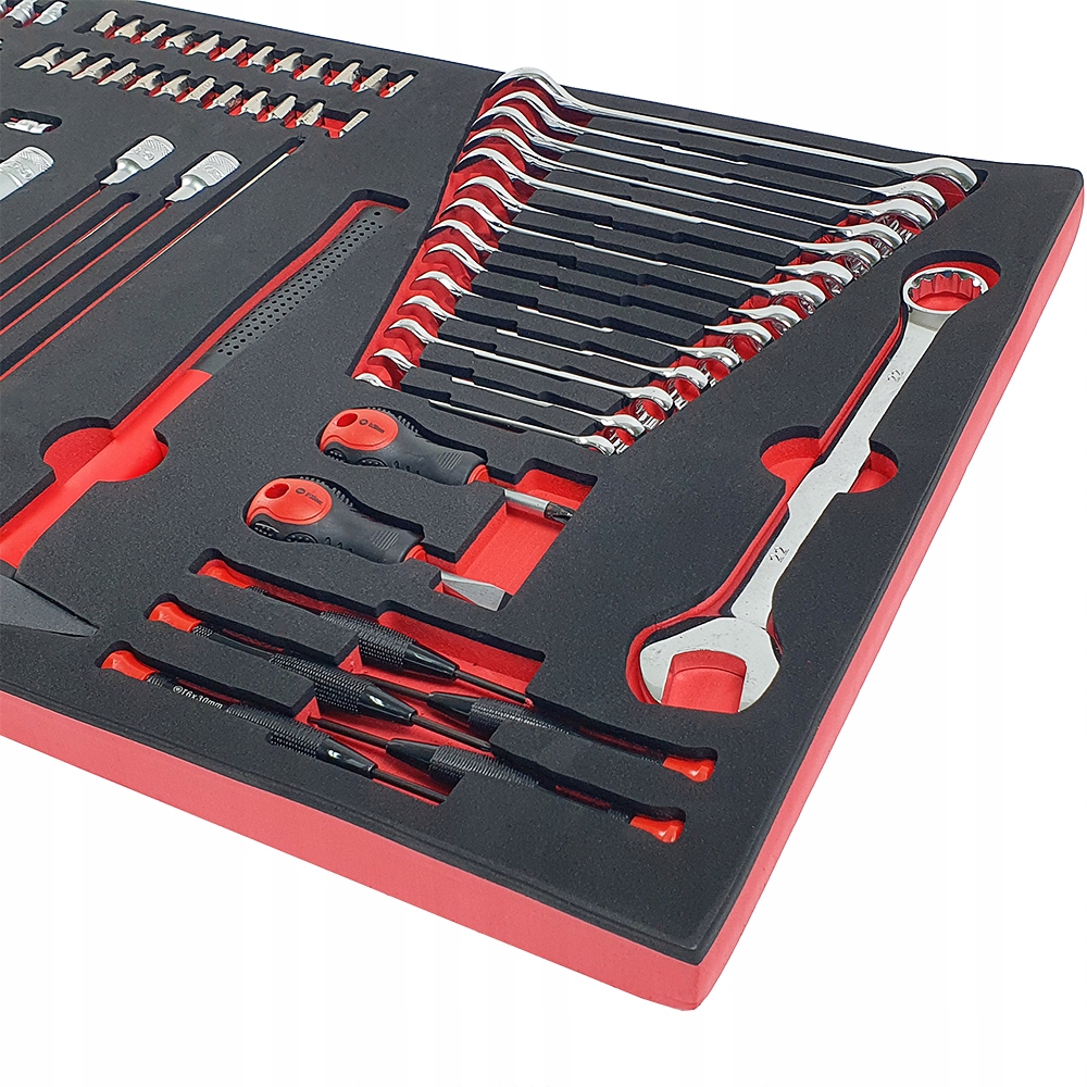 Инструменты помещены в эстетичные профилированные вставки из пенопласта EVA, которые обеспечивают идеальную организацию и порядок в мастерской. Вставки прекрасно вписываются в тележки мастерские и шкафы для инструментов, что позволяет обеспечить быстрый доступ к необходимым инструментам и поддерживать порядок на рабочем месте (размеры вставки: 40,5см х 83,7см).
