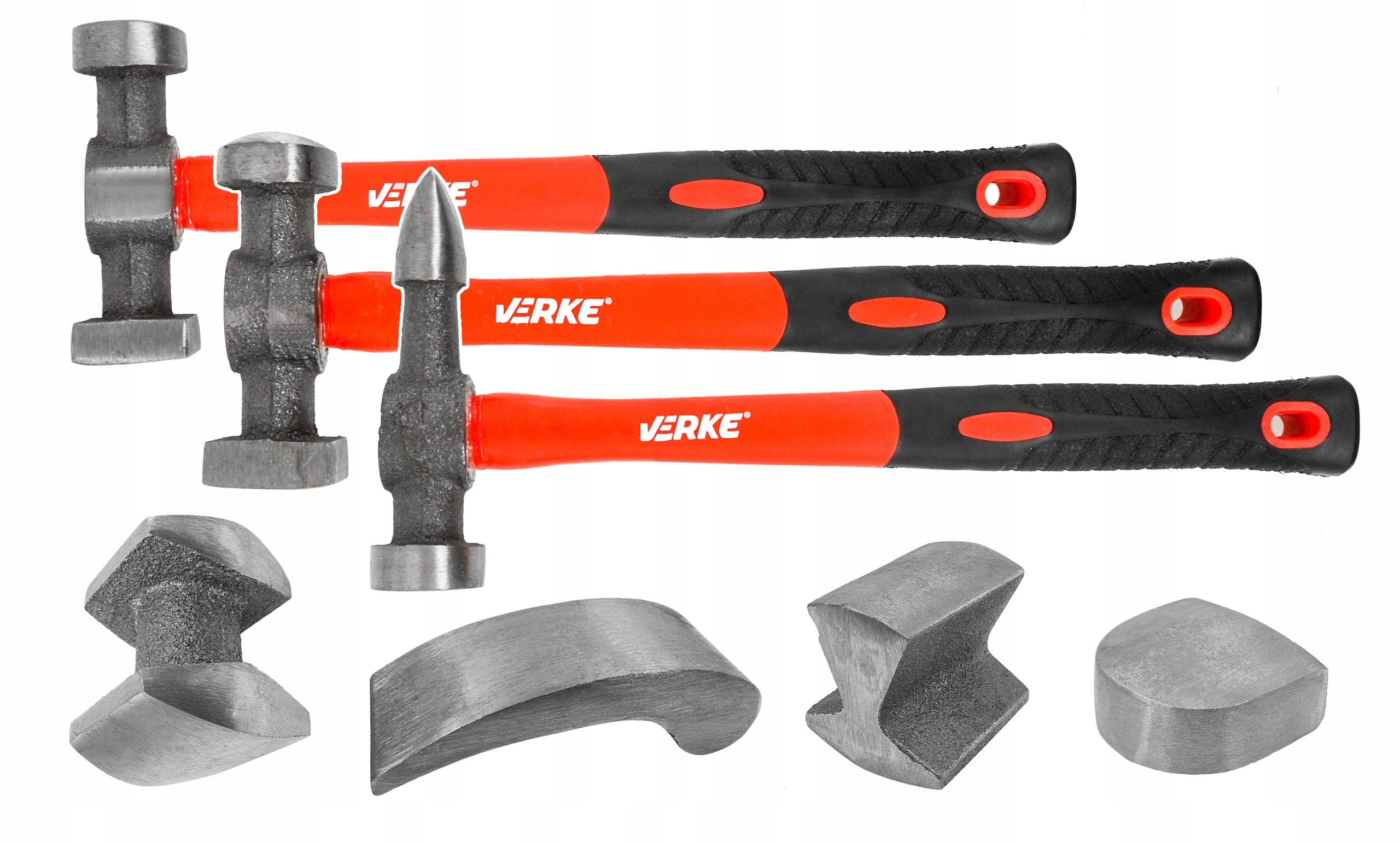 ✅ 3 молотка с характерными рабочими поверхностями: стандартный молоток из листового металла, молоток с прямым заостренным концом, молоток с круглым и квадратным концом
