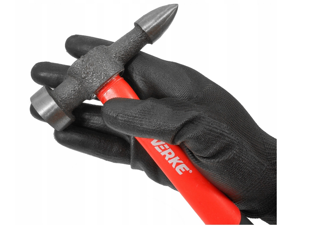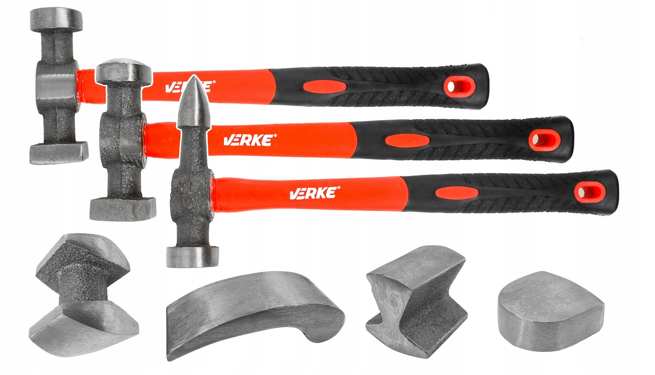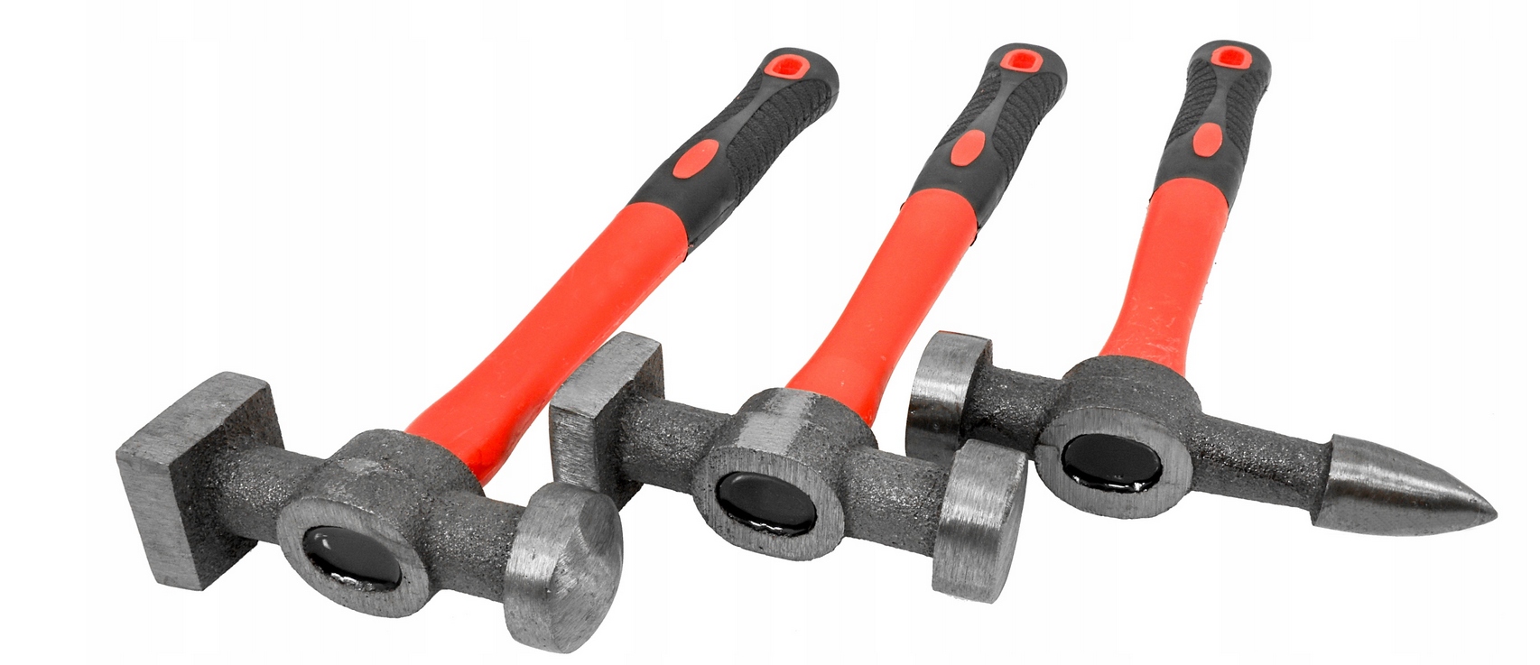 3 молотка с характерными рабочими поверхностями: стандартный молоток по листовому металлу, молоток с прямым заостренным концом, молоток с круглым и квадратным концом