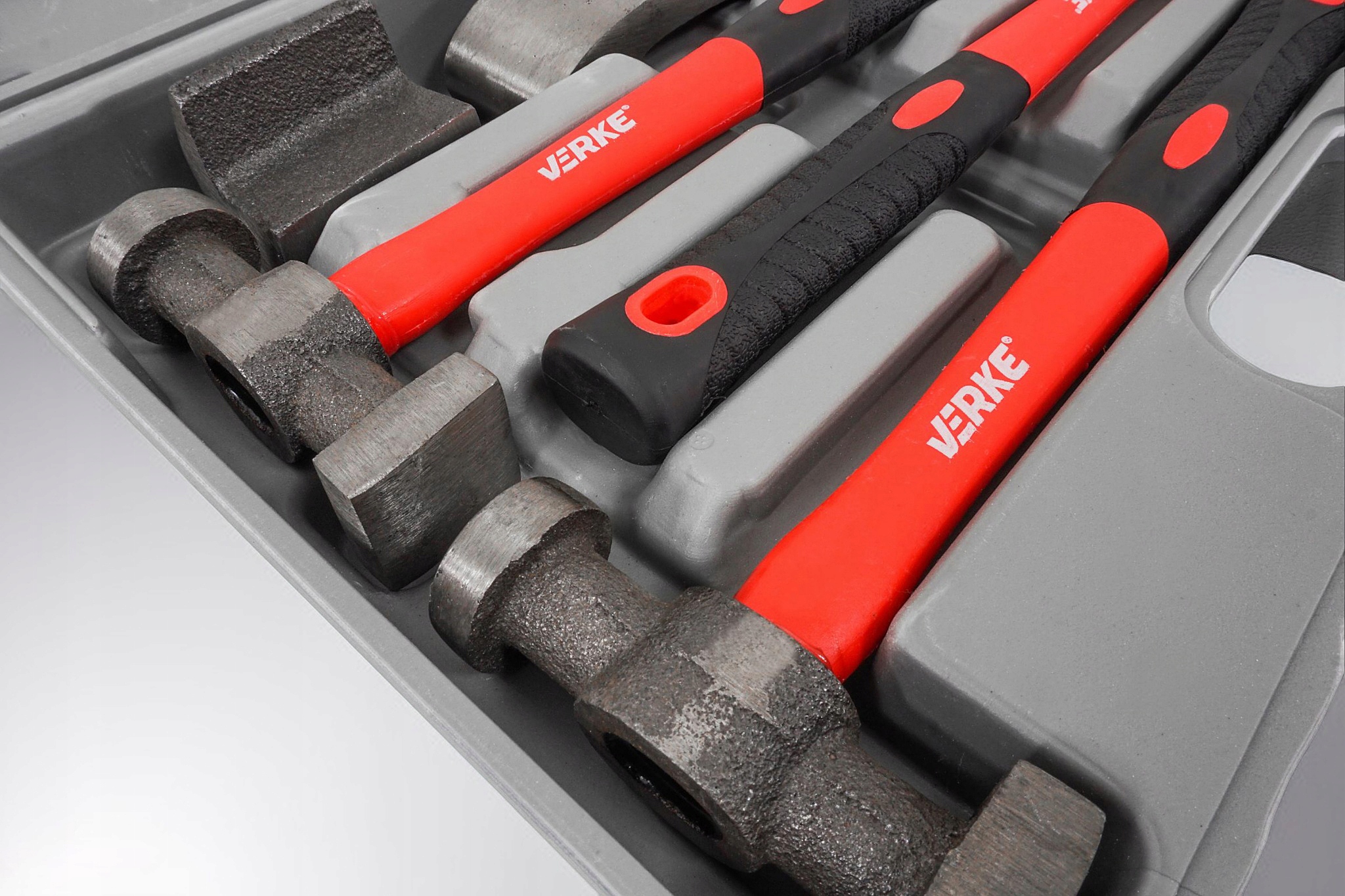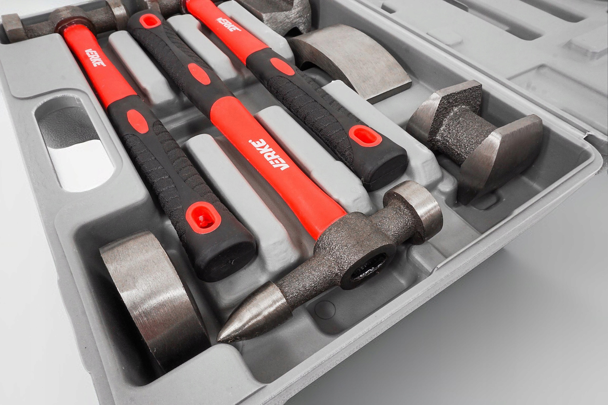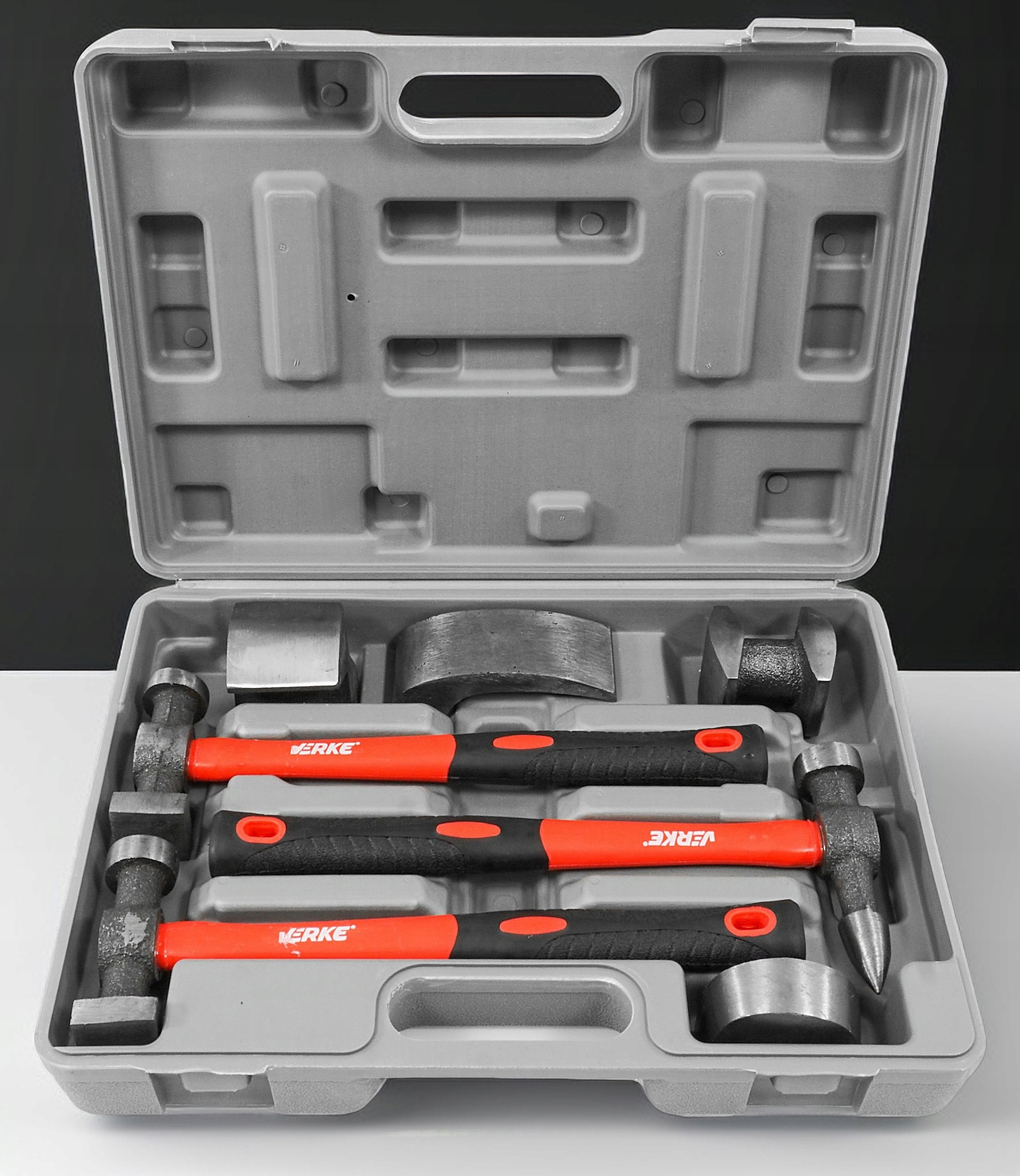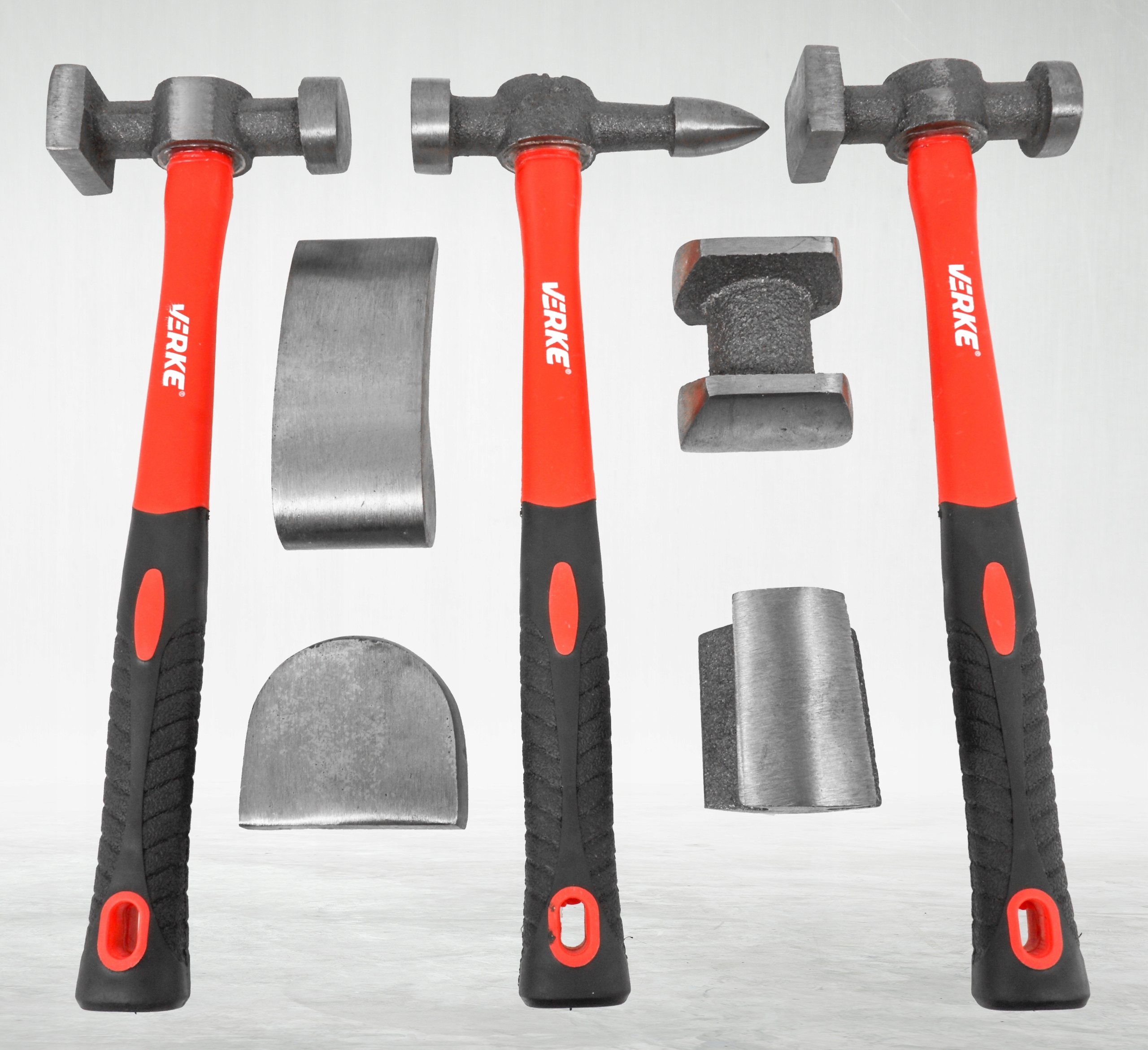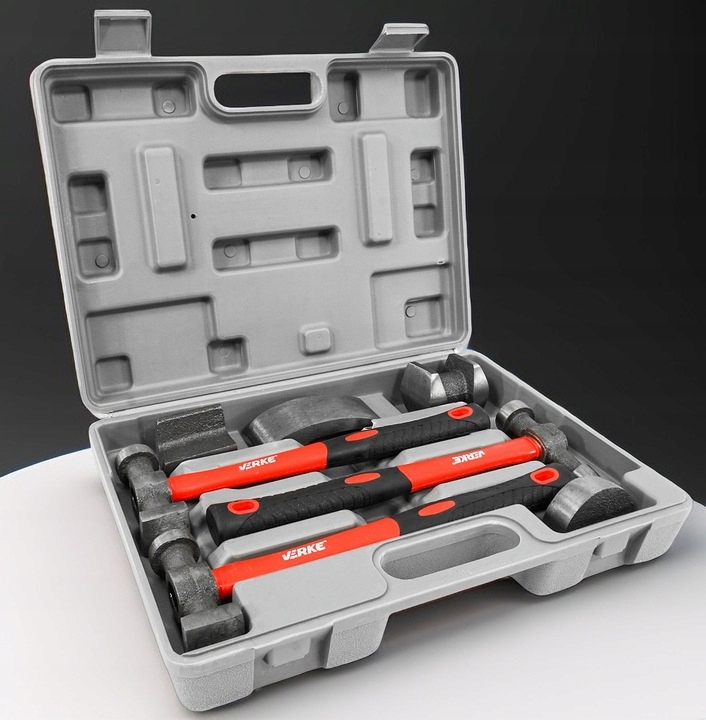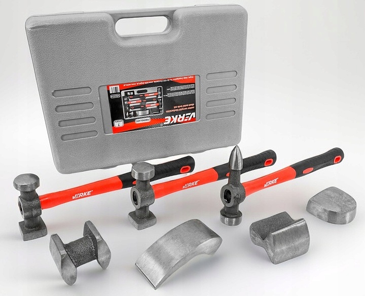 Три молотка с разными профилями головок, закрепленные на рукоятках из стекловолокна, четыре стальных профиля, используемые для профилирования листового металла.