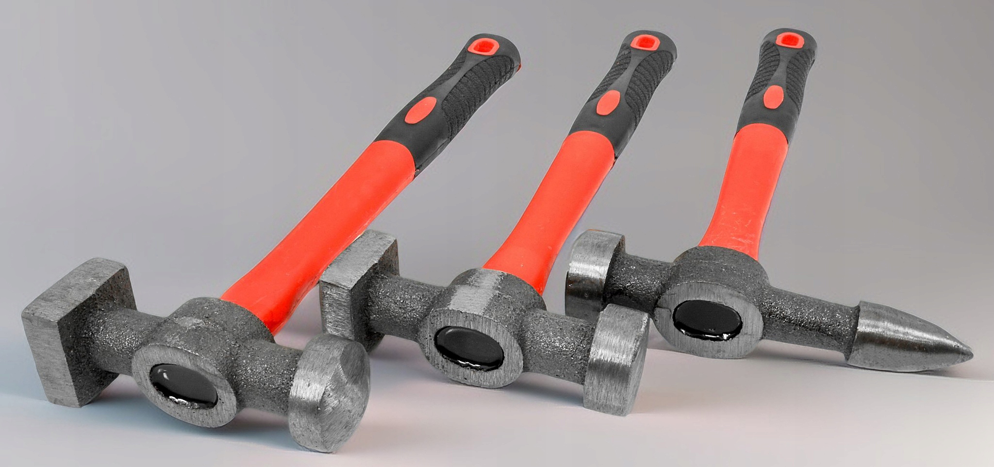 3 молотка с характерными рабочими поверхностями: стандартный молоток по листовому металлу, молоток с прямым заостренным концом, молоток с круглым и квадратным концом