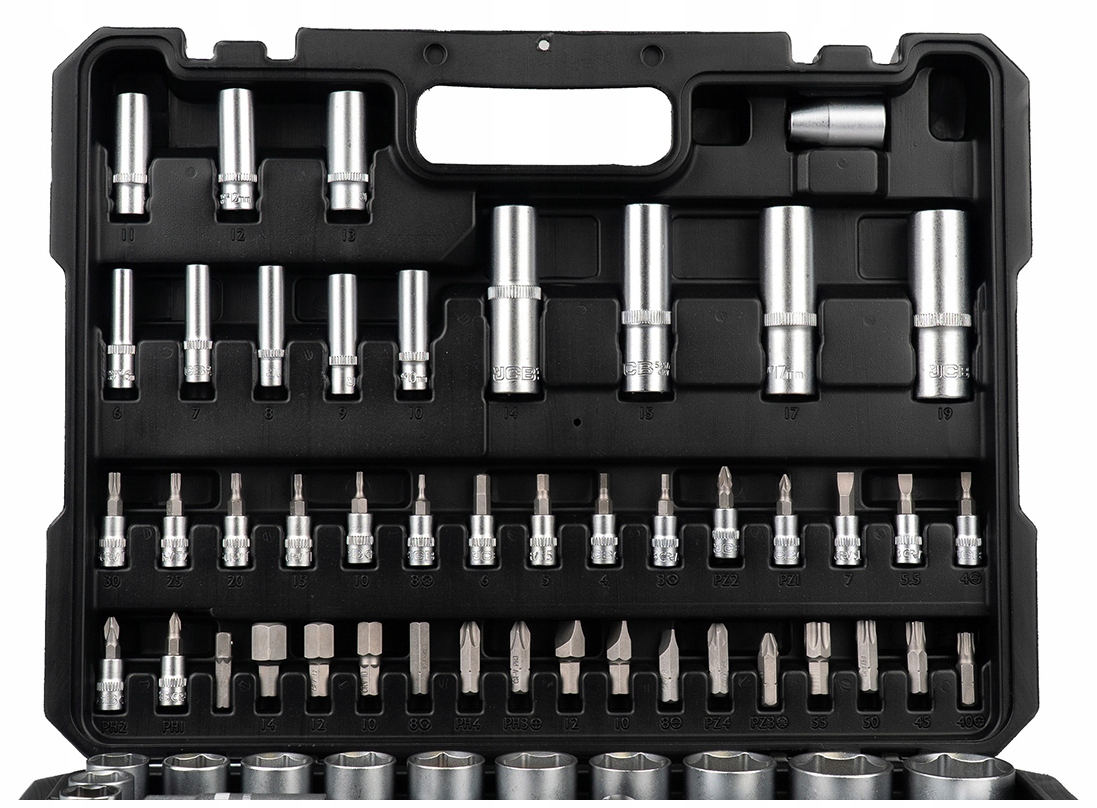 В отличие от дешевых наборов ключей, элементы в наборе JCB не выпадают со своих мест, а застежки прочно удерживают сложенный чемодан и предотвращают его случайное открытие, например, в багажнике.