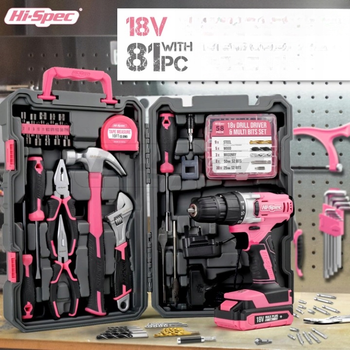 Набор инструментов для женщин девушек 81 чемодан розовый буриль отвертка