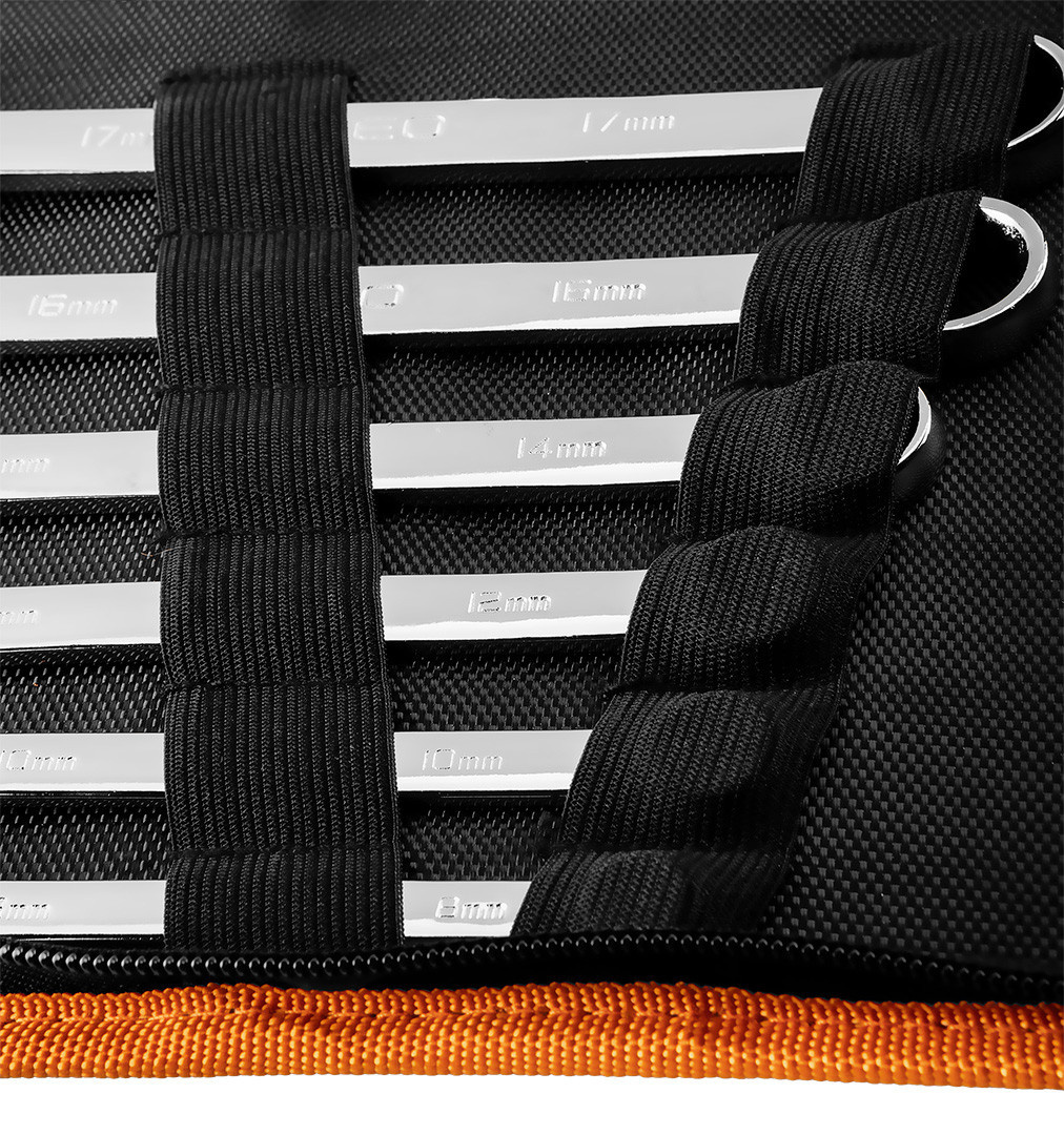 - В комплект входят комбинированные ключи — размеры: 8, 10, 12, 14, 16, 17.