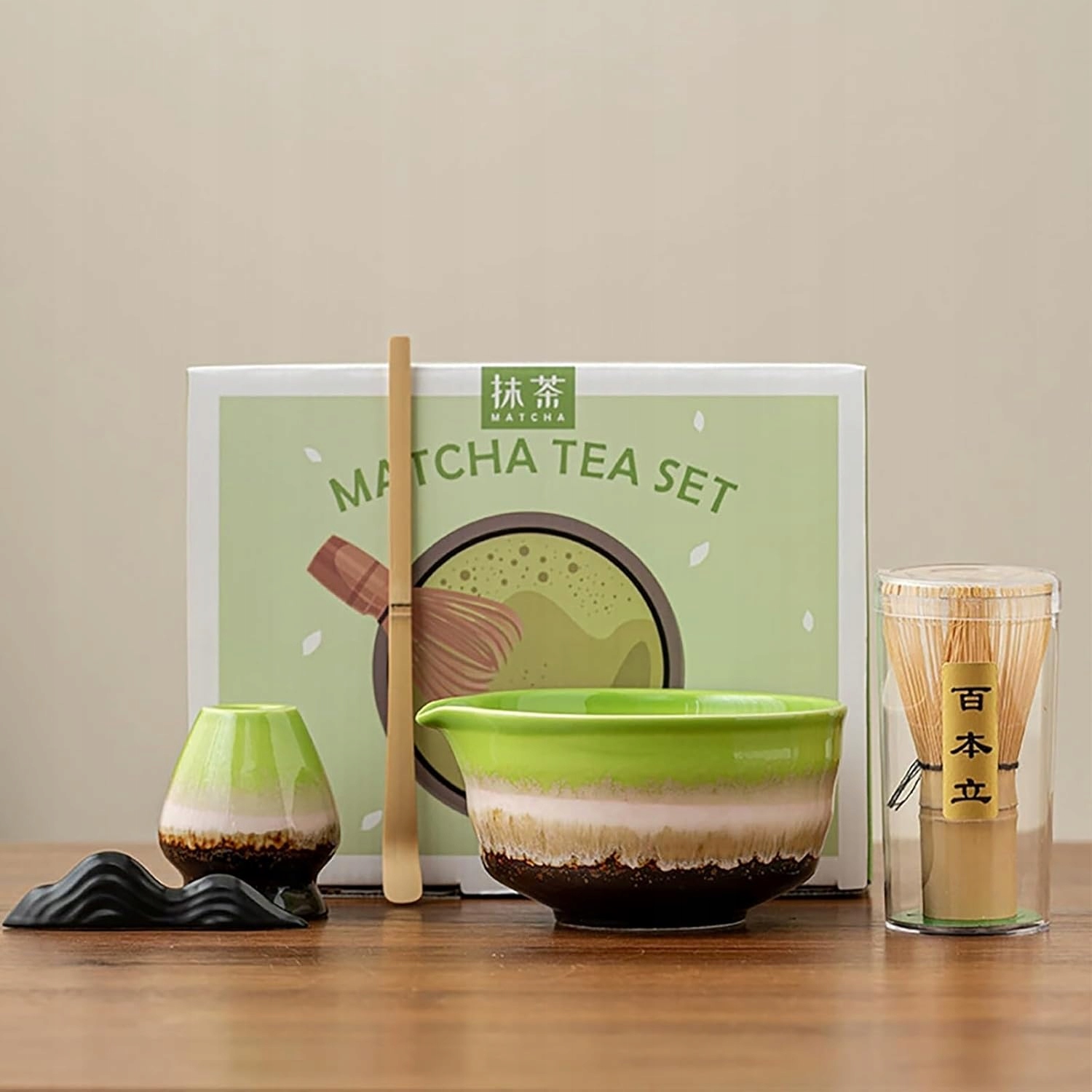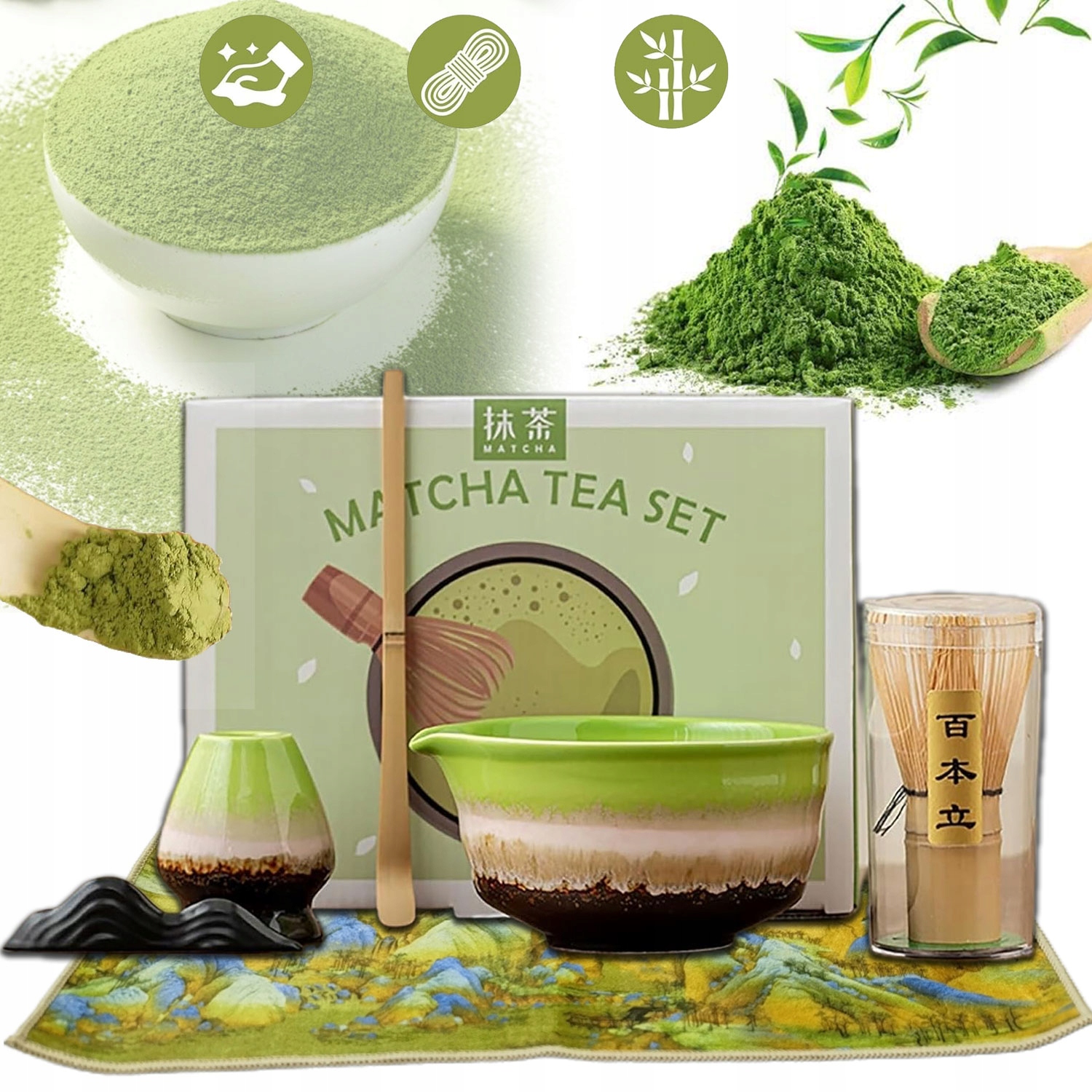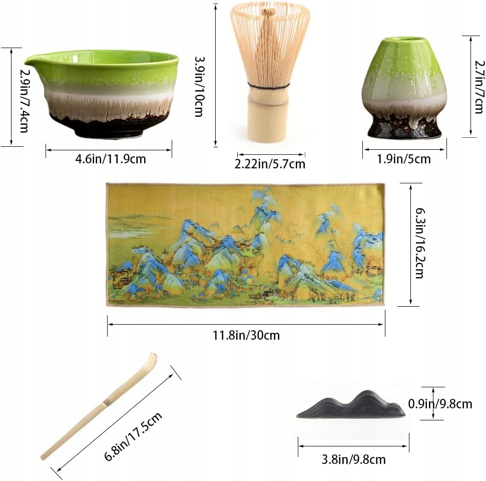 -В комплект входит 1 миска, 1 подставка для венчика, 1 венчик, 1 ложка, подставка для 1 ложки и 1 полотенце, идеально подходящее для приготовления настоящего чая матча.