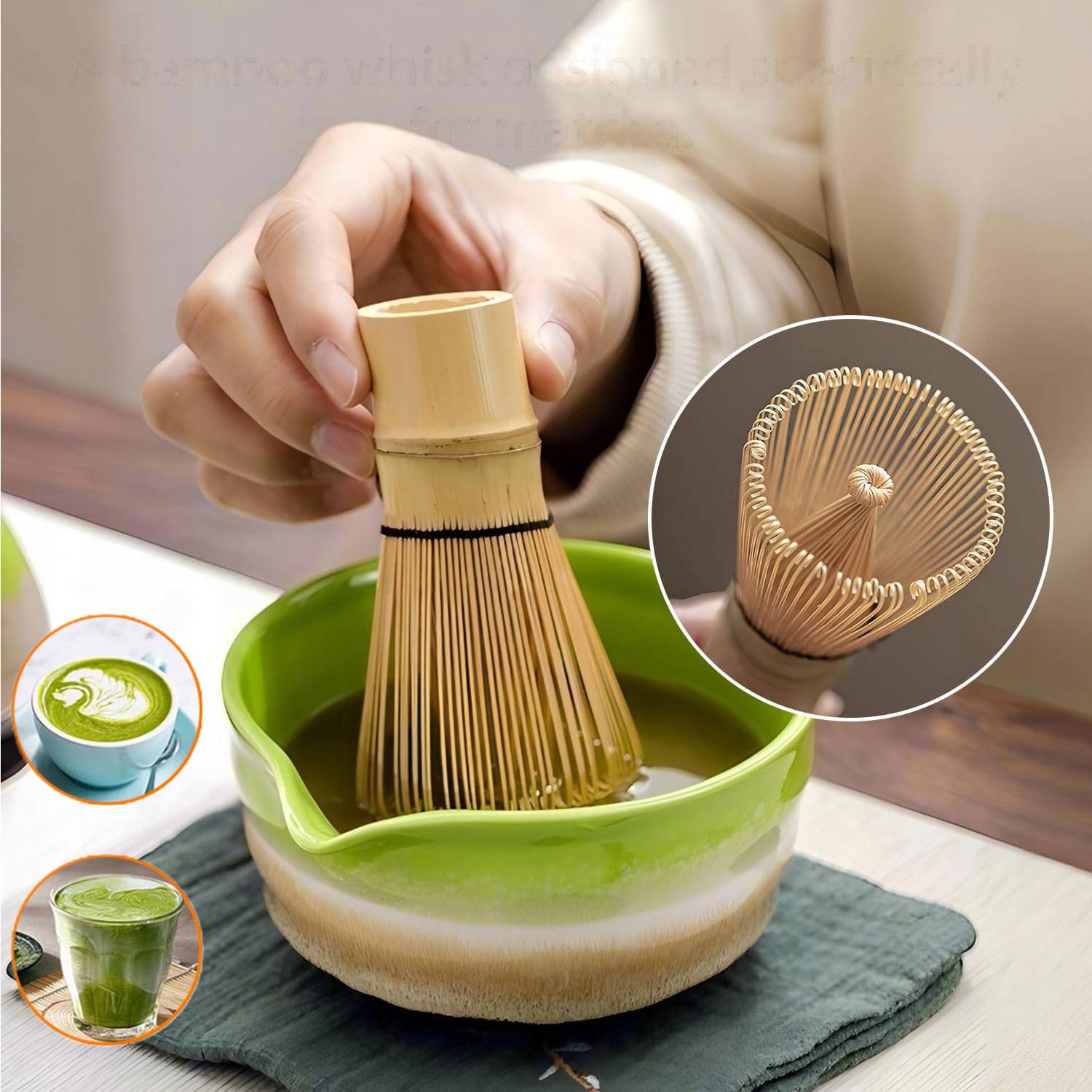 -Венчик из натурального бамбука способствует созданию густой пены без комочков. В комплект входит ложка для точного измерения.