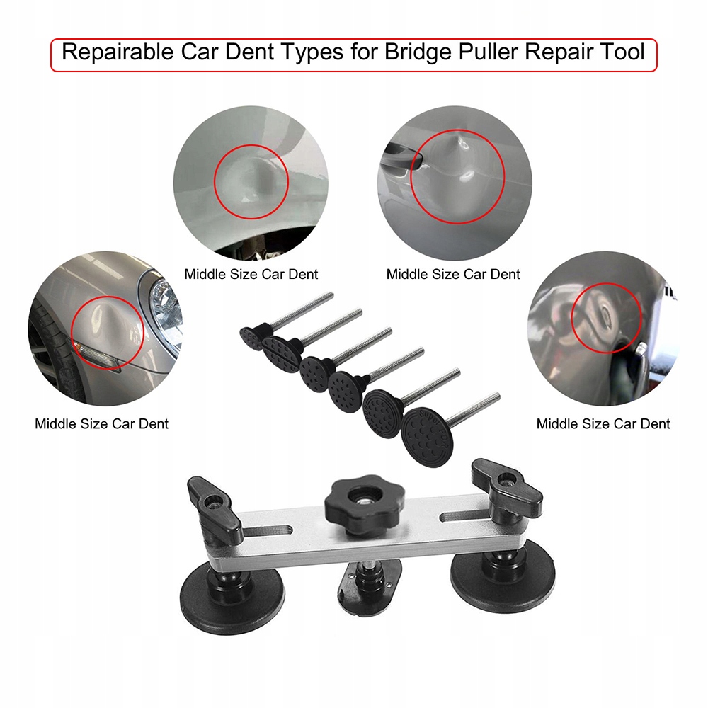 - Покраске не навредить: Dent Bridge Puller не повредит конструкцию автомобиля. 6. Прокладки разных размеров изготовлены из резины и мягких материалов, подходят для ремонта вмятин разных размеров, не повредят краске автомобиля.