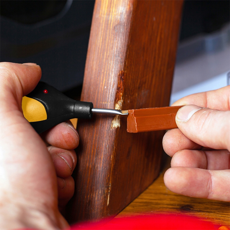 ✔️ Разогрейте стилус – возьмите воск соответствующего цвета, необходимый для заполнения повреждения.