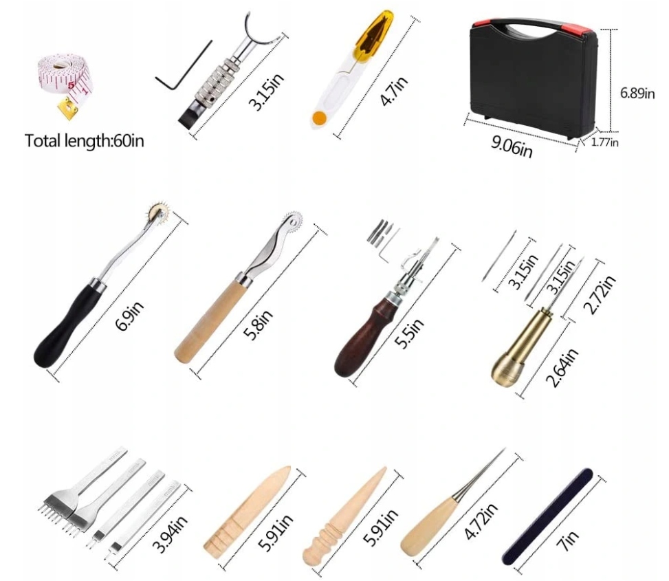 ▲ Набор инструментов для обработки кожи. Эти инструменты для работы с кожей имеют функции резки, шитья, резьбы, декоративного склеивания, шлифовки окраски кромок и другие функции для работы с кожей.