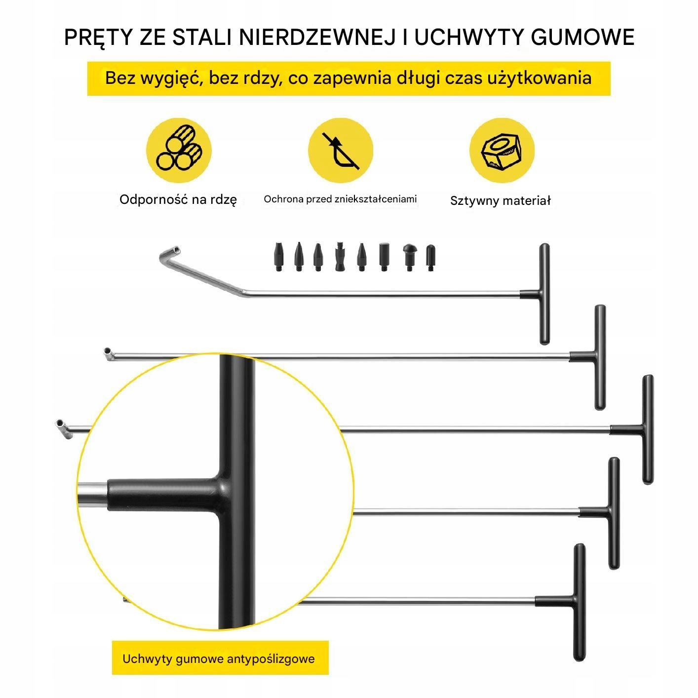 Столбцы изготовлены из нержавеющей стали, которая обеспечивает сопротивление ржавчине и долгому использованию. Кроме того, инструменты оснащены резиновыми ручками, которые устраняют риск скольжения во время работы.