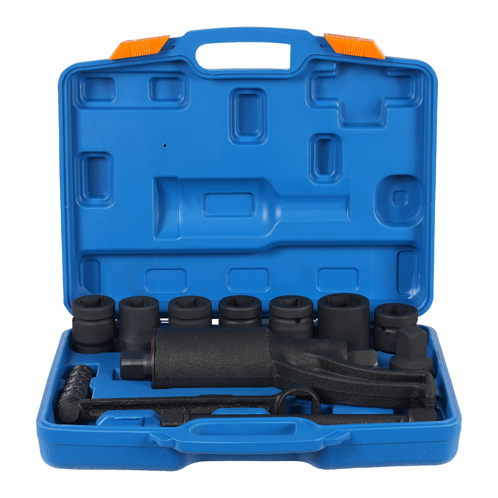 Комплексная розетка. Технические характеристики: Продукт включает в себя 7 различных размеров головок (21 мм/24 мм/27 мм/30 мм/32 мм/33 мм/38 мм) и адаптер (1 дюйм), которые обычно используются для болтов грузовых шин популярных размеров на рынке, что обеспечивает их совместимость с широким спектром моделей транспортных средств, позволяя выполнять все типы снятия и установки болтов без использования дополнительных инструментов.