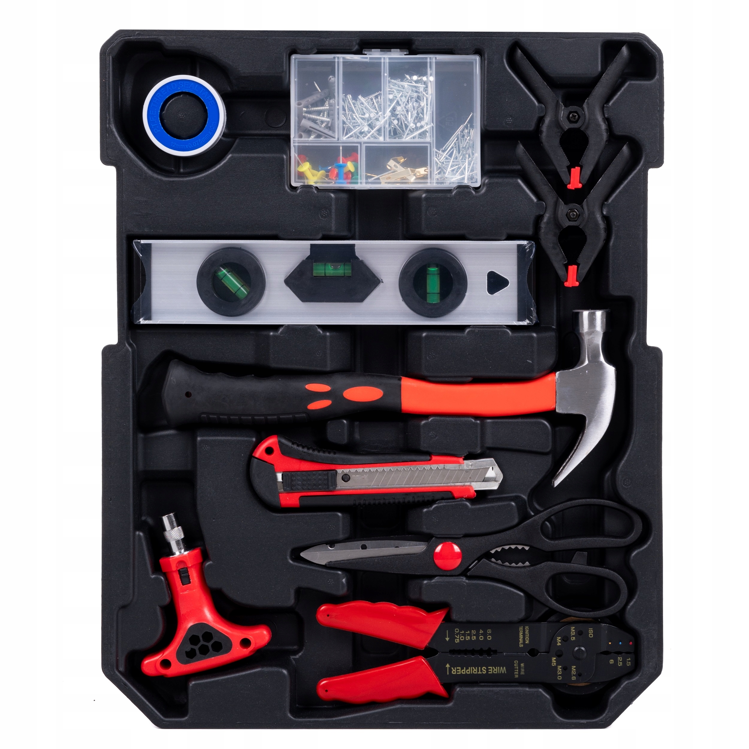 - Чемодан содержит, среди прочего, комбинированные ключи и плоскогубцы, отвертки, шестигранные ключи, плоскогубцы, молоток, спиртовой уровень, торцевые наконечники и многие другие аксессуары для инструментов.