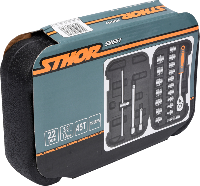 В комплект входит полный набор головок 3/8", удлинители, карданный шарнир и трещотка на 45 зубьев. Такая конфигурация делает набор подходящим для мелких сборочные работы, при механическом ремонте и многих других бытовых или мастерских работах.