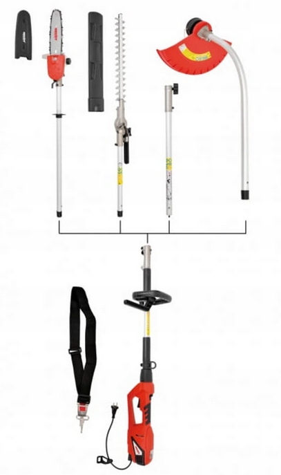 Это позволяет использовать устройство в качестве газонокосилки с рабочей шириной 36 см, пила с рабочей длиной 23 см и секатор для живой изгороди с рабочей длиной 41 см. В комплект также входит удлинительный вал длиной 50 см.