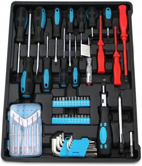 В комплект входят гаечные ключи, плоскогубцы, отвертки, торцевые головки и набор из 48 бит. Идеально подходит для любых задач!