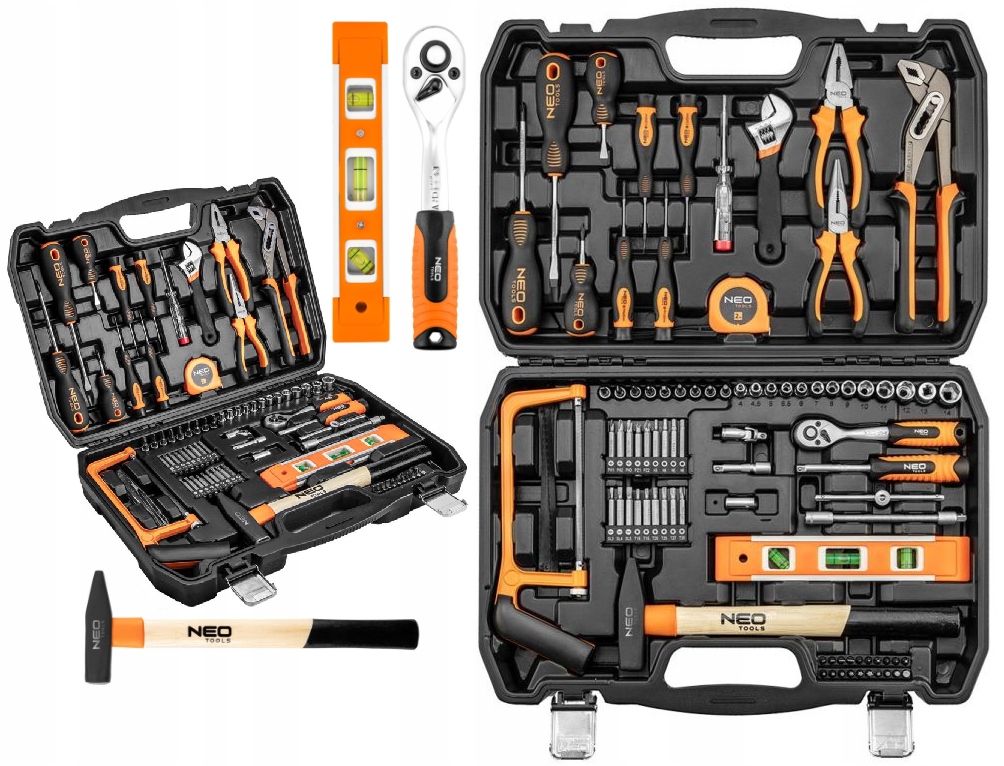 Набор инструментов из 88 элементов из 10-202 NEO Tools состоит из 88 элементов из высококачественной хромированной стали. Набор включает в себя 6/4 -дюймовый храповик, оснащенный прочным храповым сбором (72 зуба) и эргономической ручкой. Набор также включает в себя, включая пакет с прикреплением ¼ "(в размерах от 4 до 14 мм) и ¼" кончики отвертки "(плоский, крест, гексагональный, Torx). Дополнение: Регулируемый ключ, уровень, 2 -метровый стрип. К прикреплению, молотку, универсальному, плоскому и плоскогубцу, 4 отверткам и 4 точными отвертками. Длина): 30,00 x 9,20 x 44,00 см