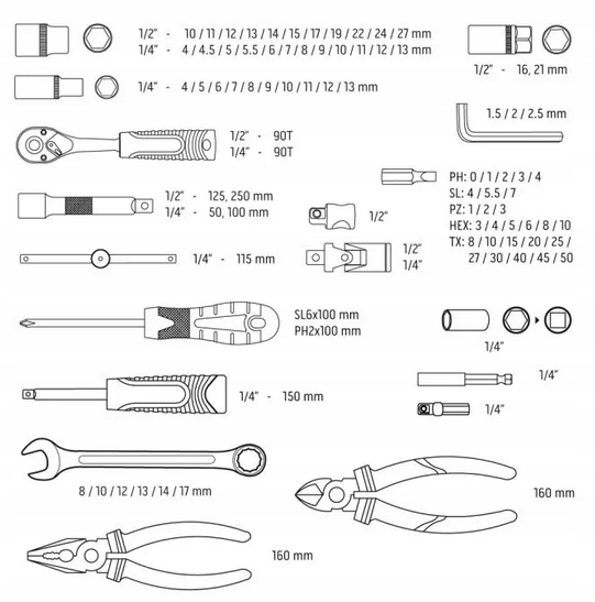 - В комплекте: трещотка 1/2" 90T, шестигранная головка 1/2" 11 шт. размеры: 4, 4,5, 5, 5,5, 6, 7, 8, 9, 10, 11, 12, 13 мм, шестигранная головка длиной 1/4 дюйма 10 шт. размеры: 1,5, 2, 2,5 мм, комбинированные ключи 6 шт. размеры: 8 , 10, 12, 13, 14, 17 мм, пассатижи комбинированные 160 мм, плоскогубцы боковые 160 мм, коробка для винтов, отвертки 2 шт. размеры: SL6x100, PH2x100, биты 1/4" 27 шт. размеры: PH0, PH1, PH2 , PH3, PH4, SL4, SL5.5, SL7, PZ1, PZ2, PZ3, HEX3, HEX4, HEX5, HEX6, HEX8, HEX10, TX8, TX10, TX15, TX20, TX25, TX27, TX30, TX40,