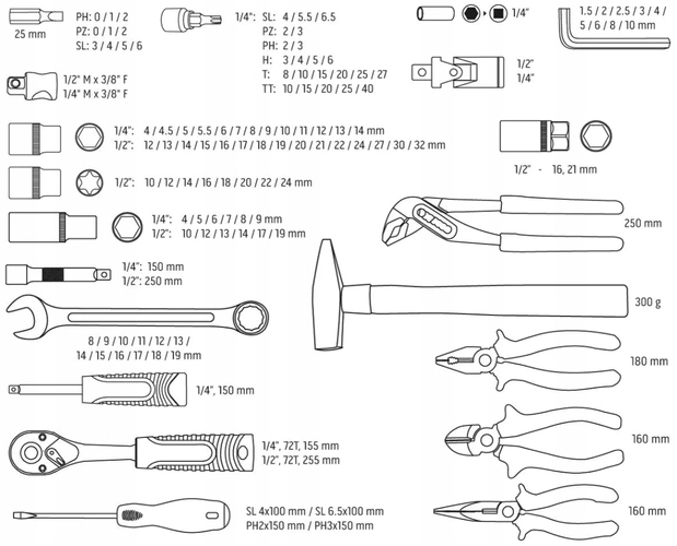 - биты 1/4" 10 шт.: PH0, PH1, PH2, PZ0, PZ1, PZ2, плоские 3, 4, 5, 6 мм, ключи шестигранные 9 шт.: 1,5, 2, 2,5, 3, 4, 5, 6, 8, 10 мм.