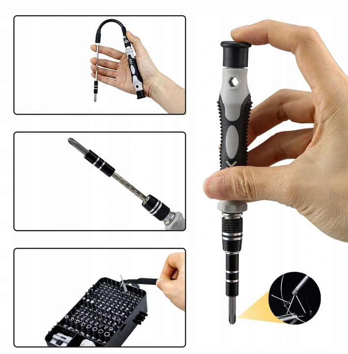 - Резиновый, гибкий, поворотный удлинитель -позволяет получить доступ к винтам в труднодоступных местах.