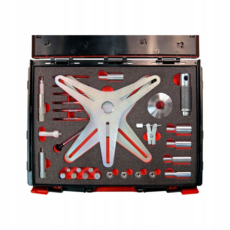 Набор инструментов SAC для самовыравнивающихся сцеплений Würth представляет собой комплексный набор, включающий в общей сложности 38 деталей, необходимых для правильной установки самовыравнивающихся сцеплений, исключающих возможность противодействующих сил во время сборки. Для удовлетворения различных требований комплект оснащен элементами, позволяющими модифицировать нажимной шпиндель в зависимости от количества шаговых отверстий на маховике. В комплект входят, среди прочего: универсальная коническая втулка для крепления диска сцепления, специальные центрирующие штифты, предназначенные для BMW, а также элементы, необходимые для работы с моделями Mercedes Benz. Изделие тщательно упаковано для обеспечения комфорта использования, его вес составляет 9770 г, размеры: высота 87 мм, ширина 280 мм и длина 500 мм. Этот комплект гарантирует надежность и точность, необходимые для профессионального обслуживания систем сцепления.