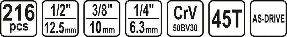Набор инструментов Sthor состоит из 216 элементов, размещенных в удобном пластиковом чемодане. Инструменты были точно изготовлены из материалов, обеспечивающих их надежность. Набор включает в себя полный диапазон длинных и коротких шапок 1/4 ", 3/8" и 1/2 ", расширения, суставы кардана и многие другие элементы, включая гремучих с 45 зубами. Эта конфигурация означает, что набор будет использоваться для небольших работ сборки, с механическим ремонтом и многими другими работами в домашнем хозяйстве или на семинаре.