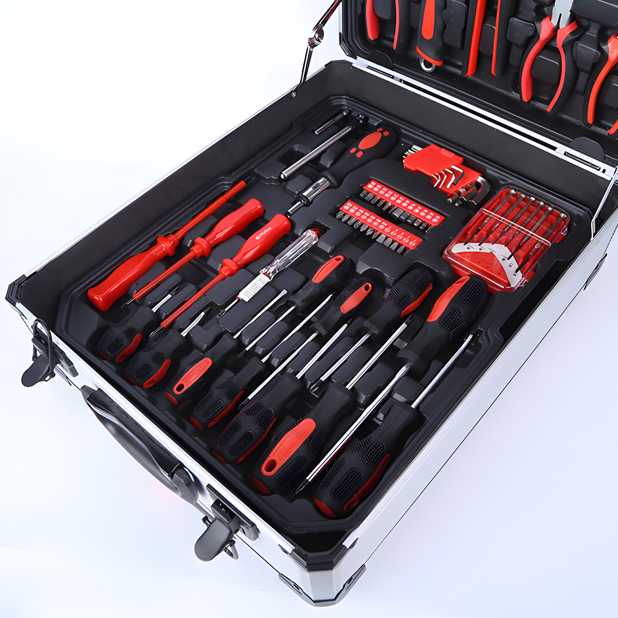 Наш набор инструментов создан из стали высочайшего качества, что гарантирует его долговечность и эффективность. Внутреннее пространство чемодана состоит из впечатляющего количества 264 элементов. Весь наш набор включает набор комбинированных ключей, накидной ключ, ключ с храповым механизмом, динамометрический ключ и набор ключей с храповым механизмом.