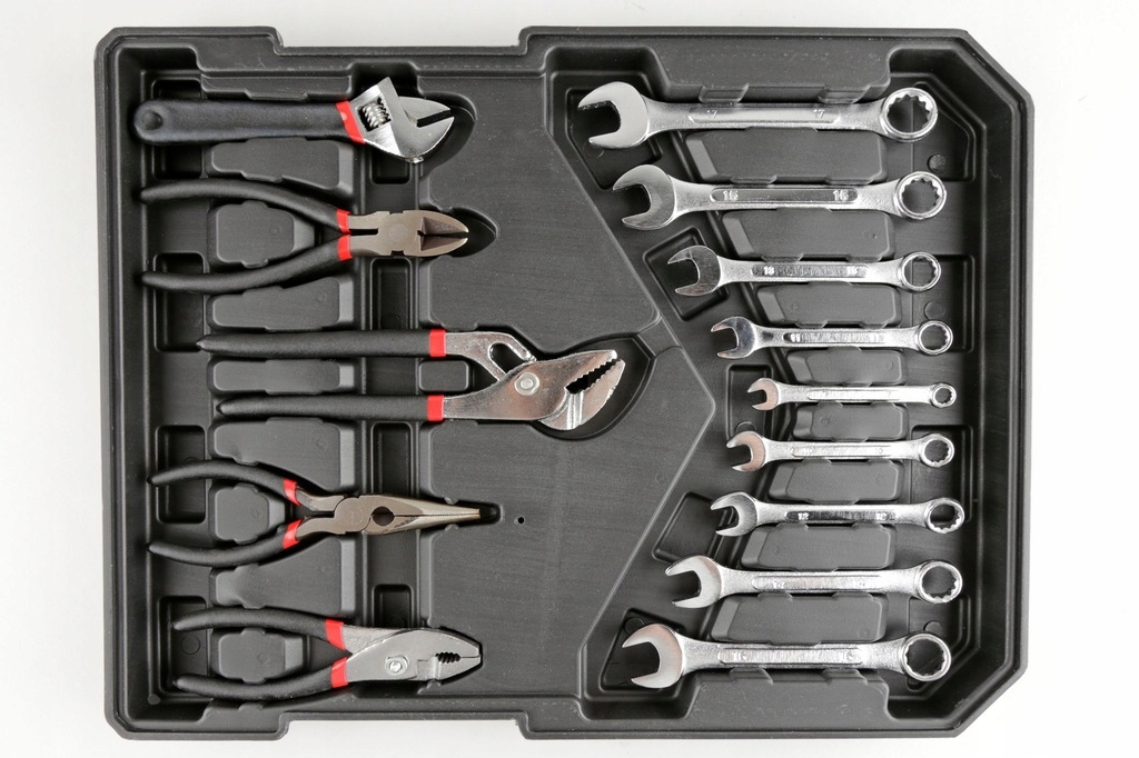 Набор из 186 инструментов в мобильном кейсе, покрытом алюминием, оснащен телескопической ручкой и колесиками для удобной транспортировки.